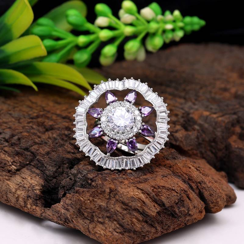 | Product Description | Ring Size Adjustable | Diameter Length: 3.00 Cm X Width: 3.00 Cm | Metal: Brass With Good Quality Silver Plated | Color: Purple | Stone: American Diamond | Gross Weight: 10.00 Grams | Package Content: 1 Piece Of American Diamond Ring |
