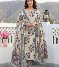 Anouk Blue And Beige Pure Cotton A Line Kurta Set With Round Neck,Na Regular Top Design Floral Print Soft Fabric Ideal For Festive Casual Occasions.