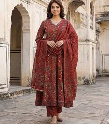 Anouk maroon printed pure cotton floor-length anarkali kurta set with dupatta