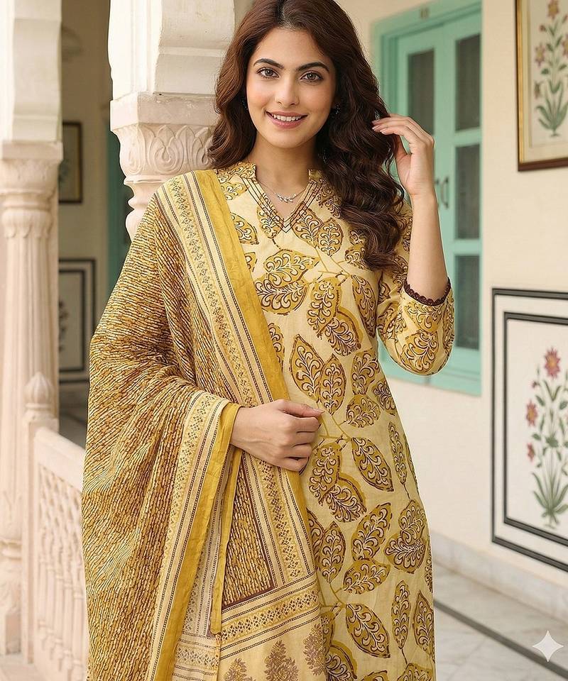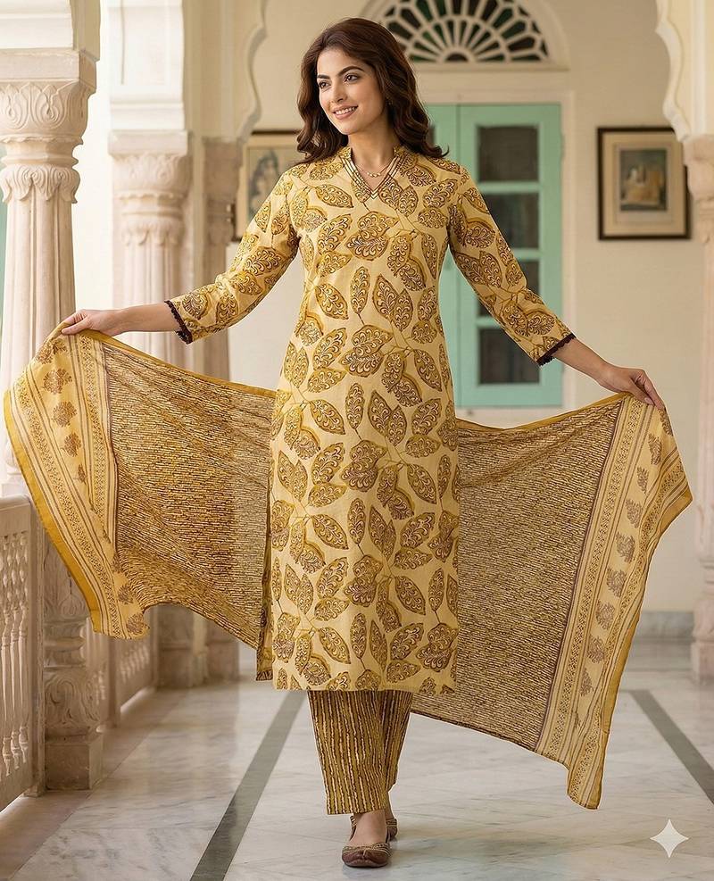 Anouk Mustard Pure Cotton Straight Kurta Set With V Neck,Side Slits Regular Top Design Ethnic Motifs Soft Fabric Ideal For Festive Casual Occasions.
