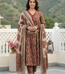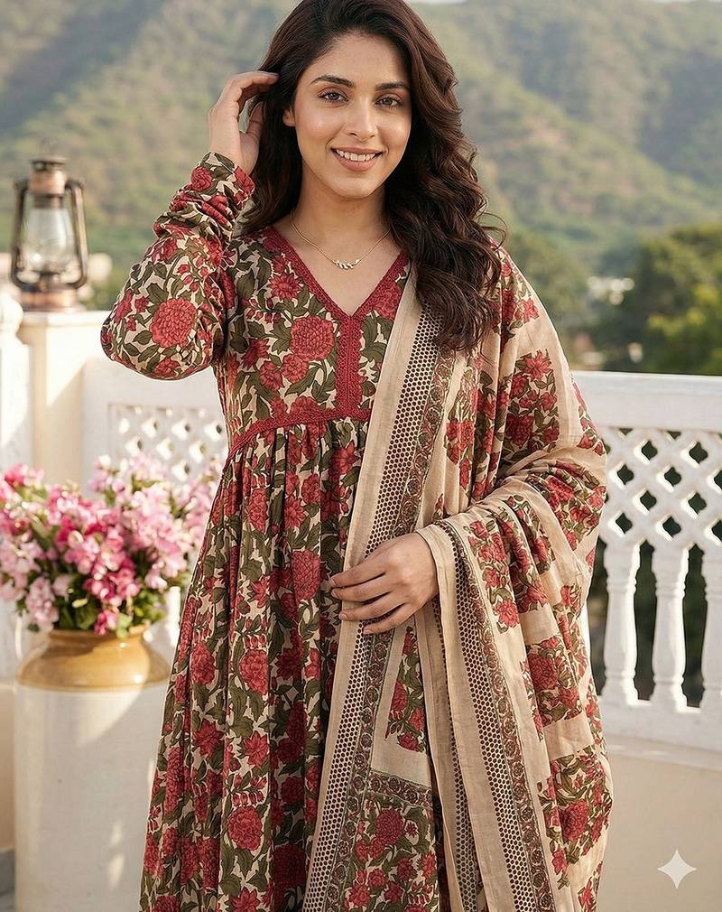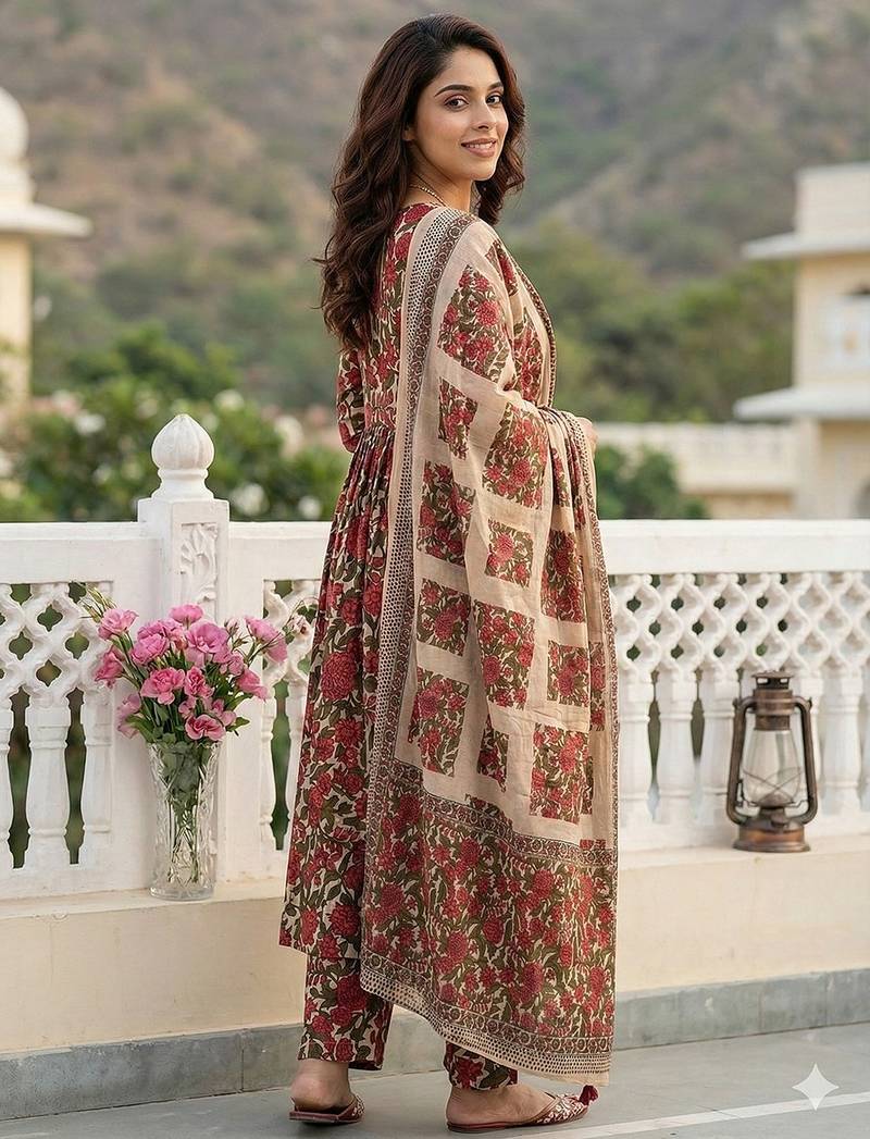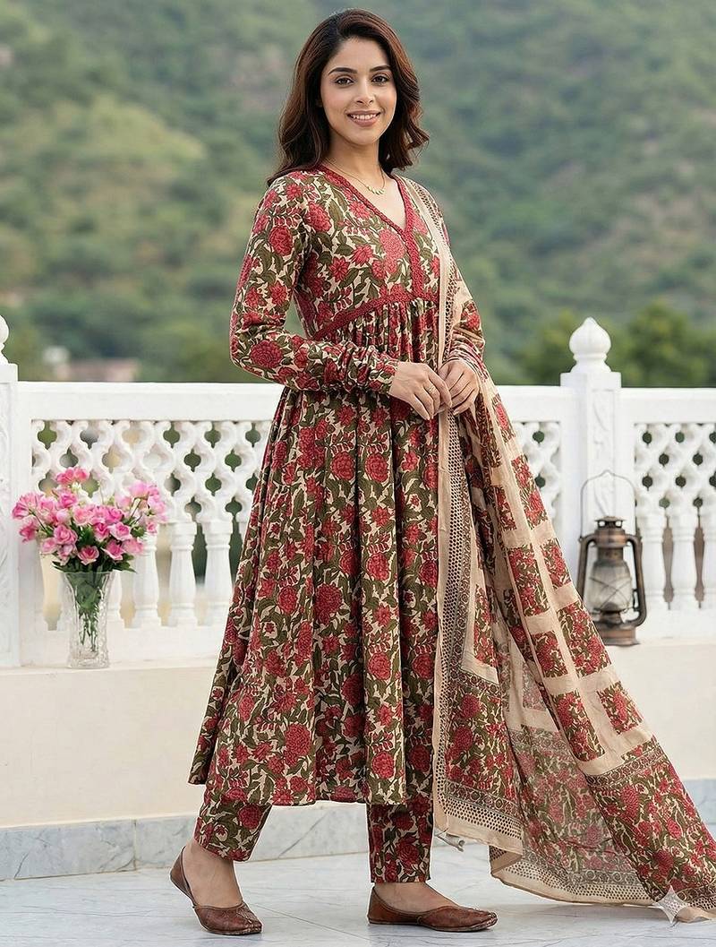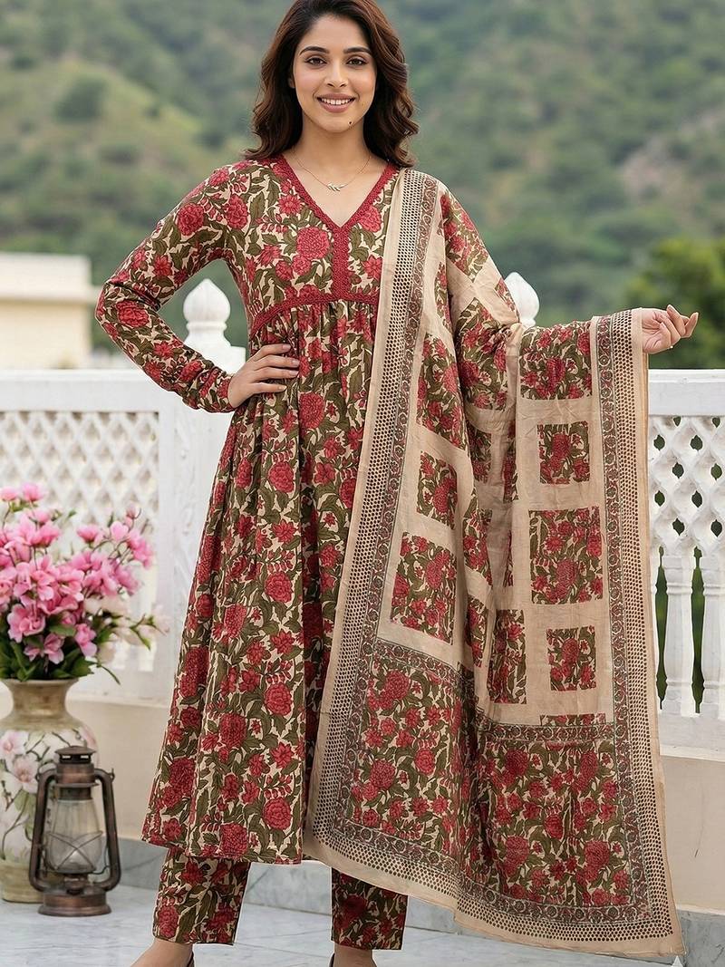 | Product Description | Anouk Red And Cream Pure Cotton Anarkali Long Sleeves V Neck With Calf Length Floral Print Kurta Set With Dupatta |