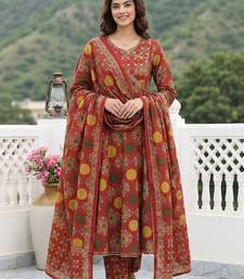 Anouk red and yellow printed pure cotton anarkali kurta set with dupatta