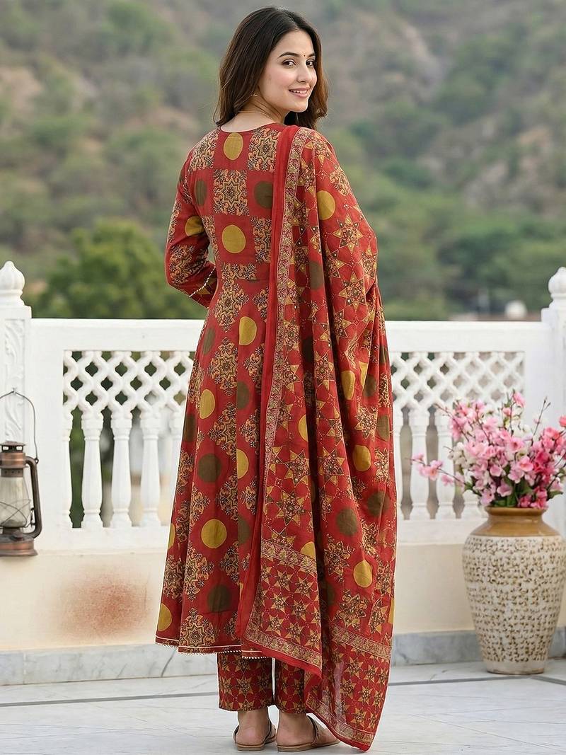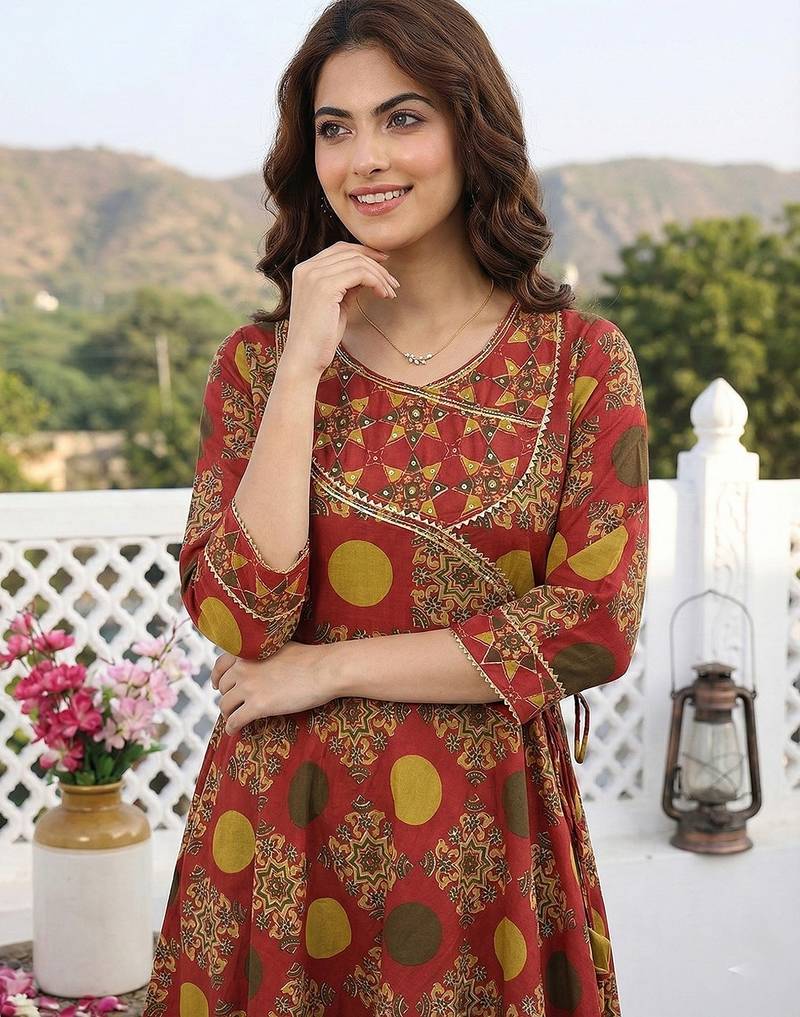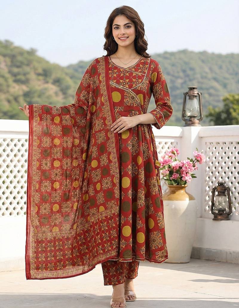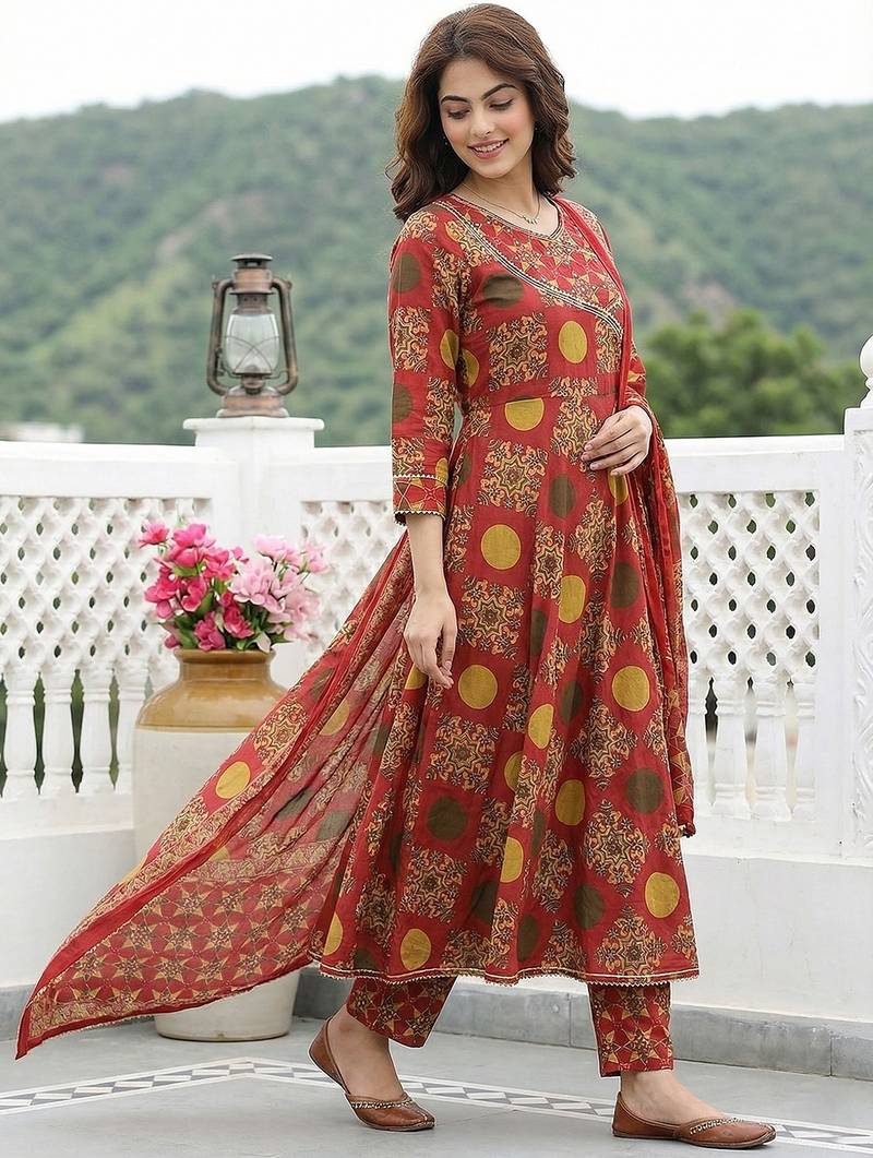 | Product Description | Red And Yellow Pure Cotton Anarkali Kurta Set With Printed Angrakha Style Kurta, Flared Calf Length Hem, V Neck, And Three Quarter Sleeves. Paired With Trousers And Voile Dupatta. Festive And Comfortable. |