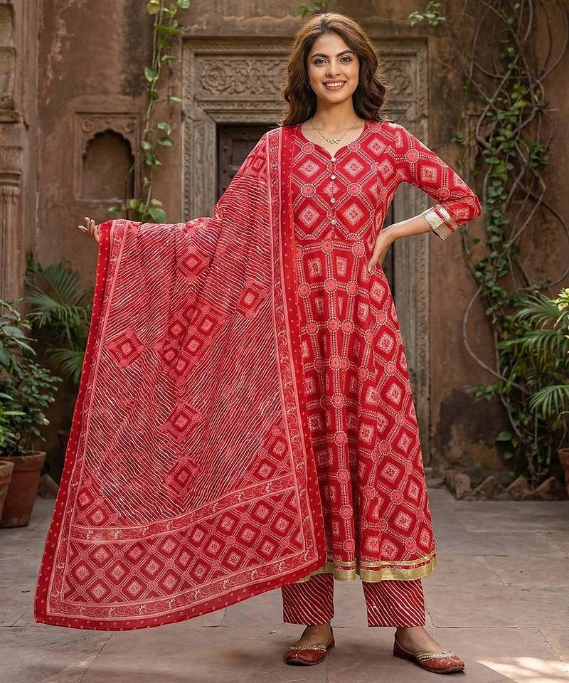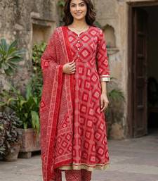 Anouk Red Pure Cotton Anarkali Three Quarter Sleeves Sweetheart Neck With Calf Length Geomertric Kurta Set With Dupatta