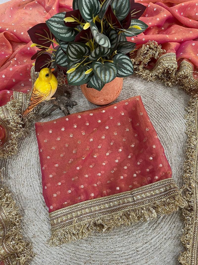 Peach moss silk with jecquard butti saree with unstitched blouse