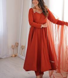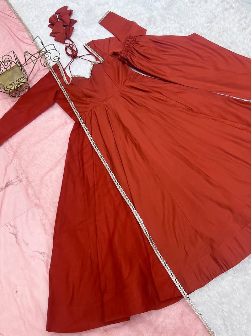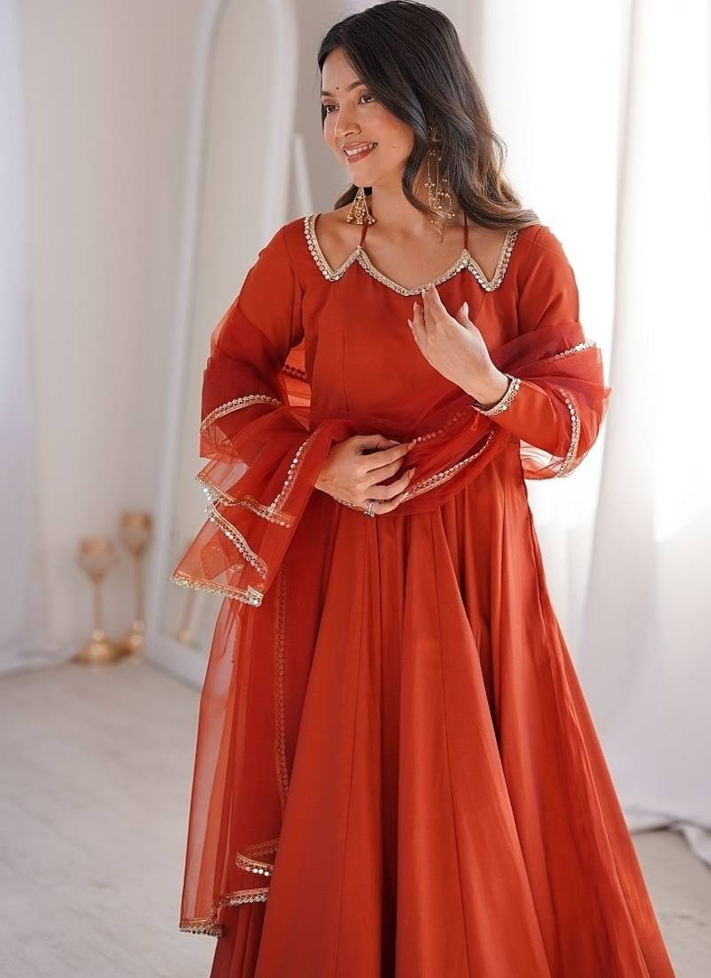 Women rust ethnic anarkali kurta set for festive & wedding wear stitched
