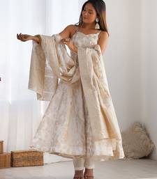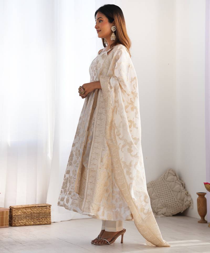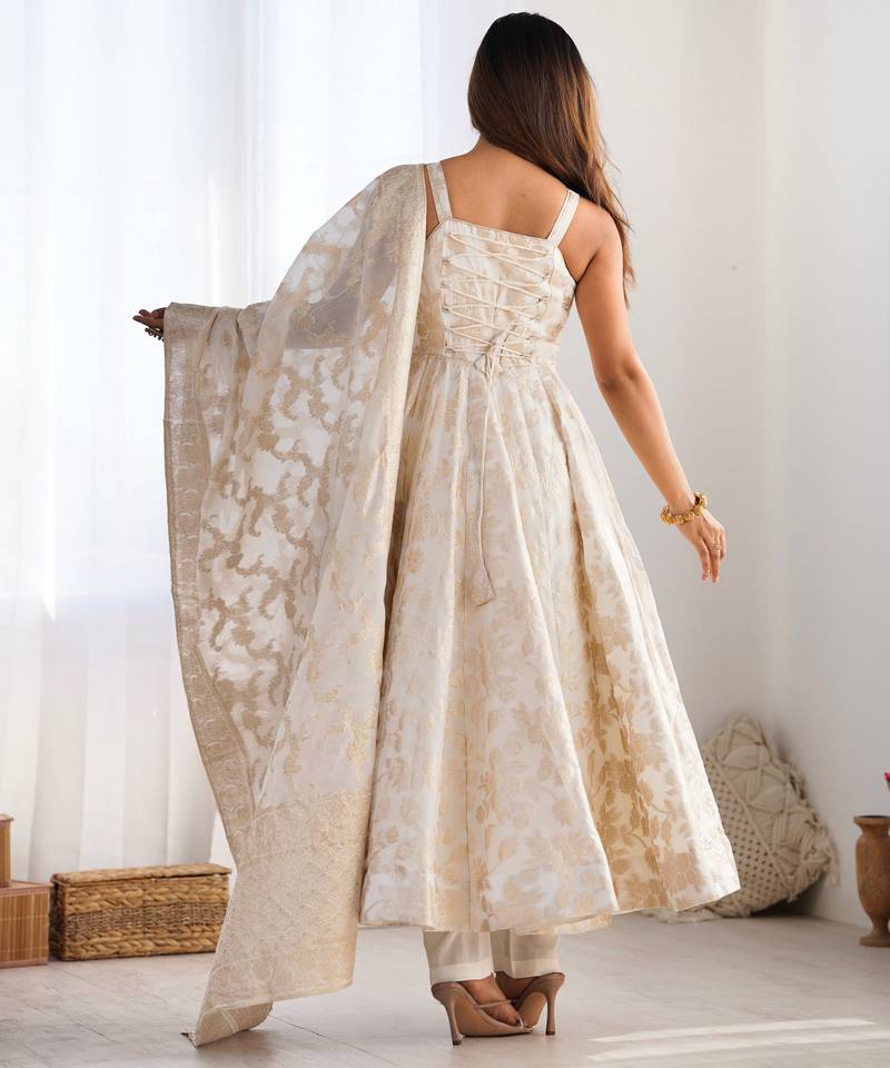 Wedding & festive special jacquard anarkali suit in cream & gold stitched