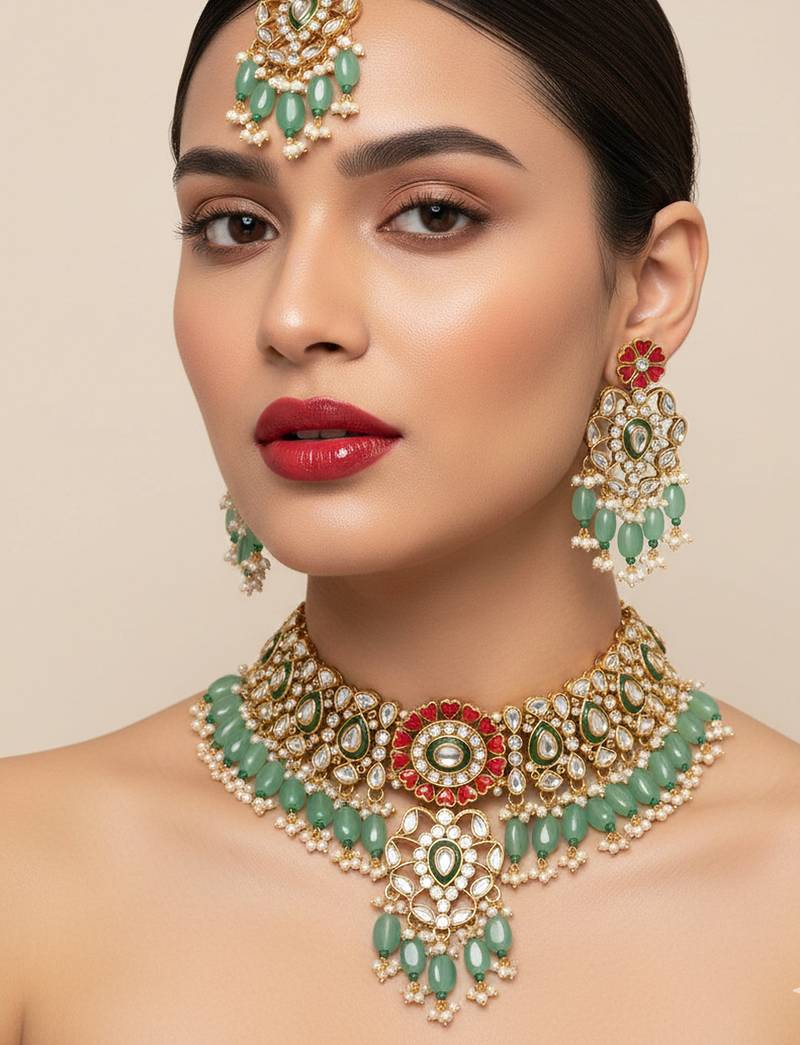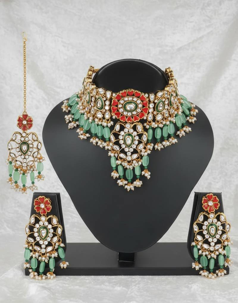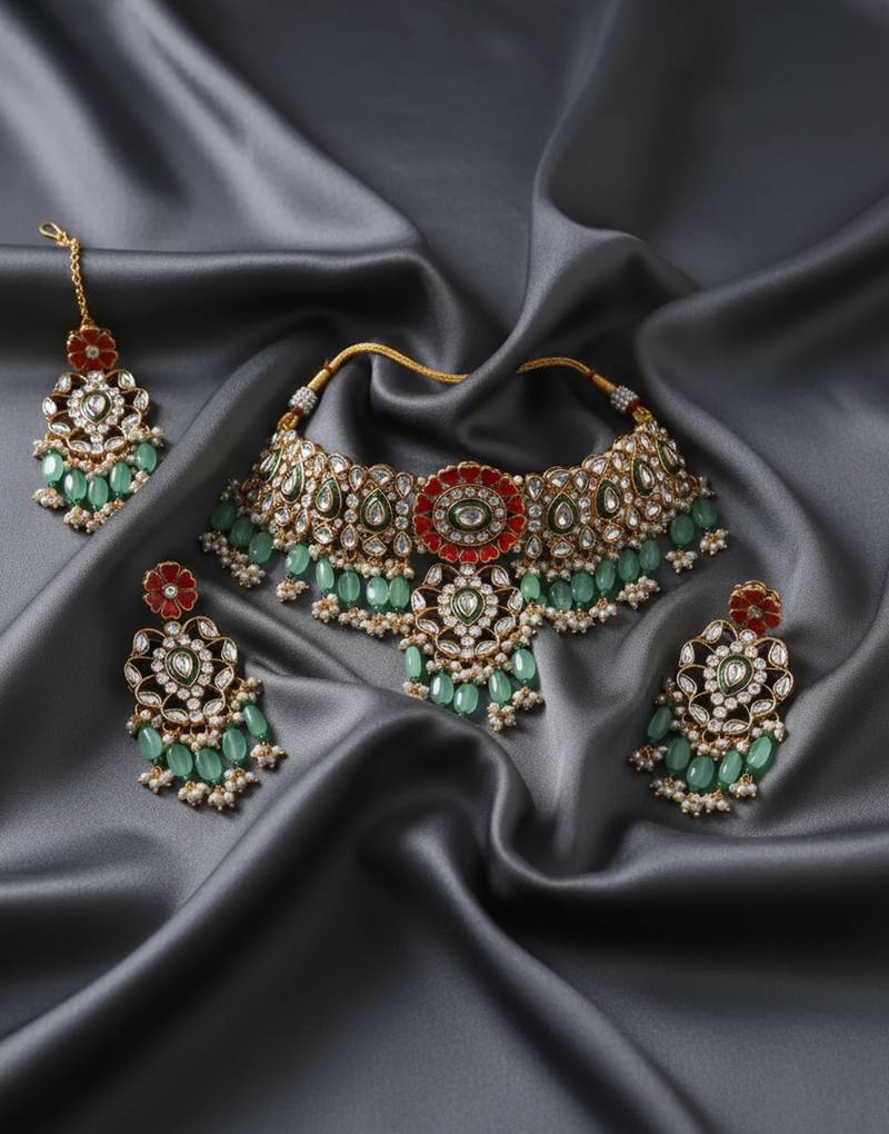 | Product Name | Elegant Kundan & Meenakari Choker Set Traditional Green & Red Bridal Jewelry With Maang Tikka | |