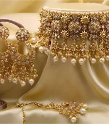 The Set Showcases A Harmonious Blend Of Gold Toned Metal Work And Glistening Kundan Stones, Creating A Regal Aesthetic Perfect For Your Special Day. The Choker's Elaborate Pattern Is Punctuated By Dangling Pearl Drops, Adding Movement And Grace To The Design.