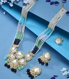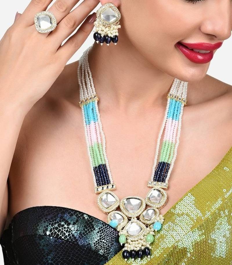 | Product Description | Shine Bright With This Spectacular Kundan Mirror Necklace Set Featuring A Striking Multicolor Beaded Strand, Bold Teardrop Shaped Mirror Stones, And Coordinated Earrings With Matching Ring. The Pastel Beadwork Blends Beautifully With Navy Blue, Mint Green, Pink, And White Hues, Making It A Statement Piece For Festive Occasions And Indian Weddings. The Bold Kundan Pendant, Accentuated With Dangling Green And Blue Beads, Adds Grandeur And Charm. Paired With Oversized Kundan Earrings And A Royal Mirror Ring, This Set Is A Perfect Choice For Fashion Forward Bridesmaids Or Festive Fashionistas. ✅ Key Features: Multicolor Pastel Seed Bead Strands With Rich Detailing Large Kundan And Mirror Stone Pendant Coordinated Oversized Kundan Earrings And Ring Included Gold Polished Alloy Base For Lasting Shine Ideal For Festive Wear, Haldi, Mehndi, Or Wedding Receptions 📦 Package Includes: