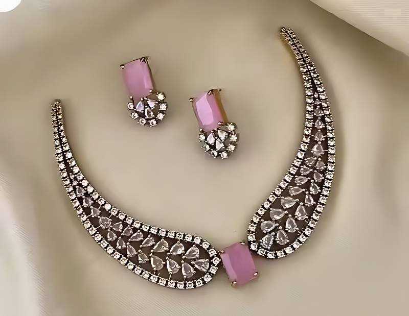 Pink american diamond necklace set | cz crystal party wear jewelry for women
