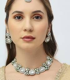 This Elegant Kundan Choker Necklace Set Features A Beautifully Crafted Design With Pear Shaped And Floral Kundan Stones Set In A Rich, Traditional Pattern, Paired With Matching Earrings And A Delicate Maang Tikka For A Complete Ethnic Look. The Premium Gold/Silver Tone Plated Finish With Shimmering Stones Gives A Royal Feel, Making It Perfect For Brides, Bridesmaids, And Wedding Guests Who Want A Statement Jewelry Set For Special Occasions.