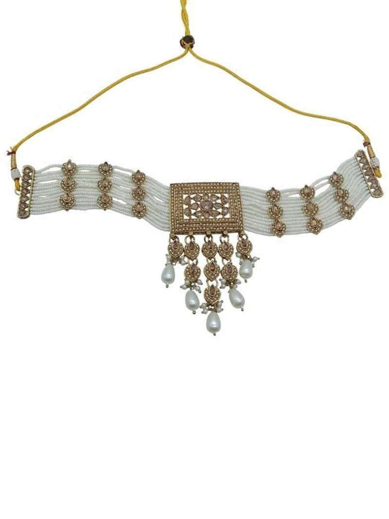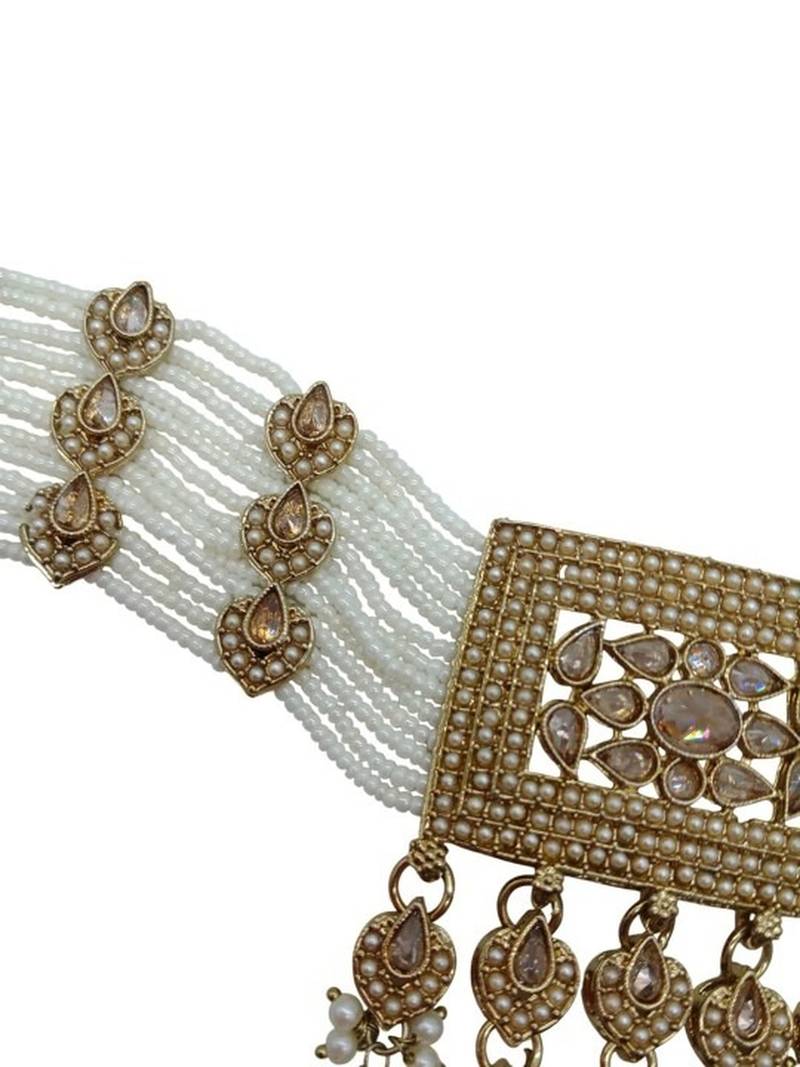 Product Name Traditional Ethnic Antique Gold Plated Pearl Bridal Choker Set With Earrings, Maang Tikka