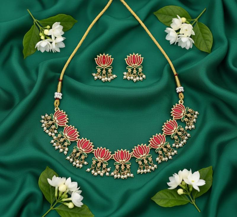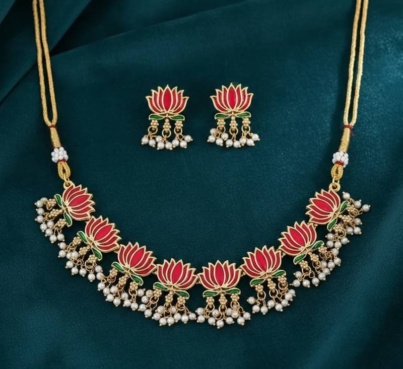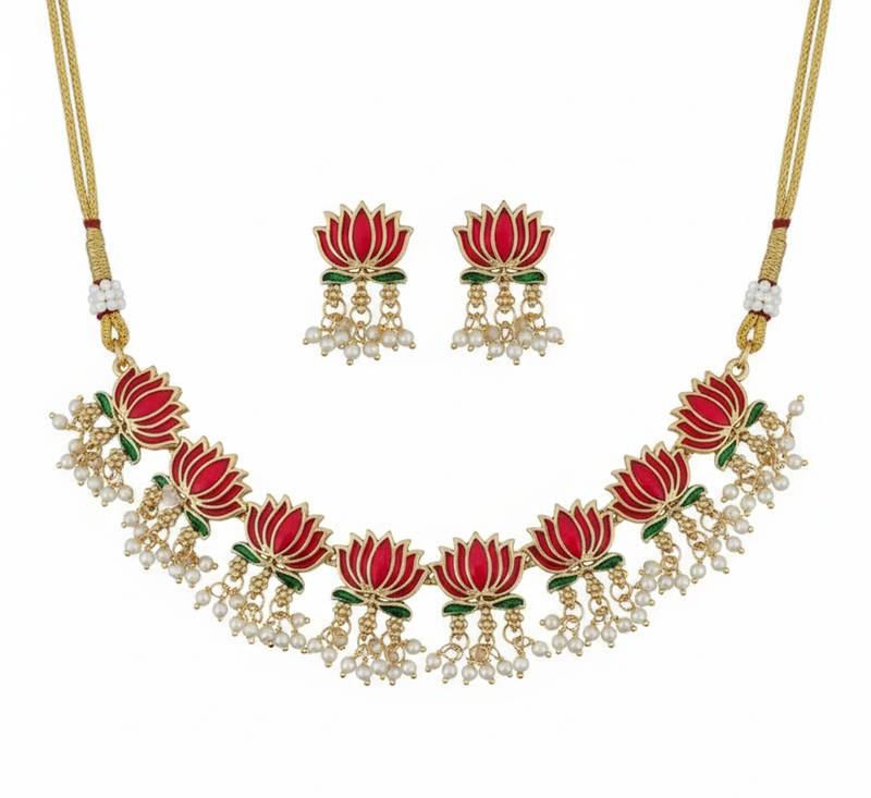 Make A Graceful Statement With This Traditional Handcrafted Gold Plated Lotus Kundan Necklace Set, Designed To Celebrate Timeless Indian Artistry. Inspired By The Elegance Of Blooming Lotuses, This Ethnic Necklace Set With Matching Earrings Features Intricate Craftsmanship, Rich Enamel Detailing, And Delicate Pearl Drops That Add Regal Charm To Every Look.