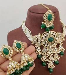 Elevate Any Traditional Or Indo Western Look With This Stunning Gold Plated Green Kundan Beaded Necklace Set, Complete With Matching Jhumka Style Earrings And Maangtikka For A Full Bridal Or Party Wear Ensemble. The Rich White Beads, White Pearl Clusters And Intricate Kundan Work Create A Luxurious Handcrafted Feel That Instantly Draws Attention In Wedding Photos, Festive Celebrations And Special Occasions Worldwide.