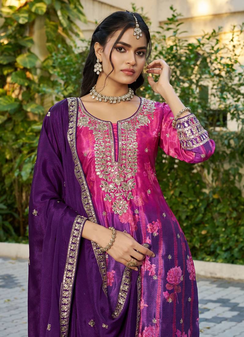 | Product Name | Pink And Purple Embroidered Chinon Free Size Stitched Palazzo Style Salwar Suit | |