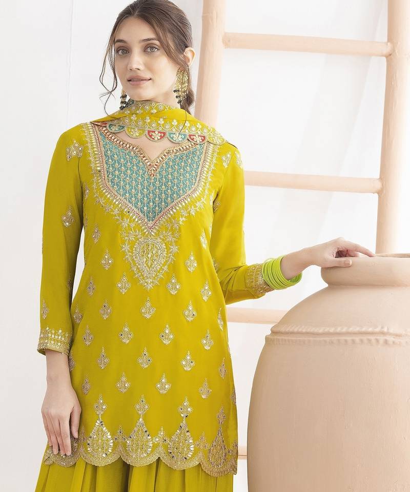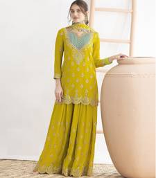 Yellow embroidered chinon palazzo style salwar suit semi stitched