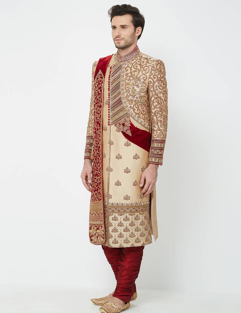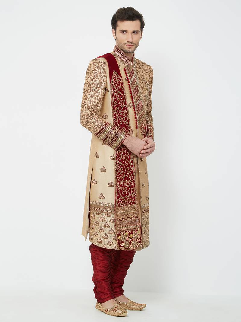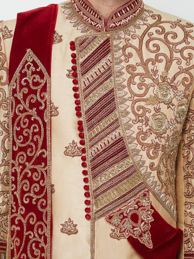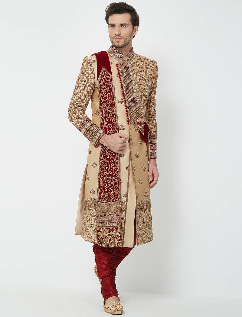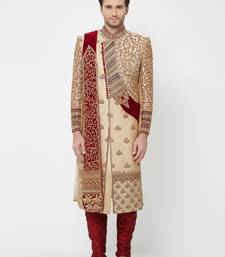 Gold silk straight embroidery with handwork sherwani for men's