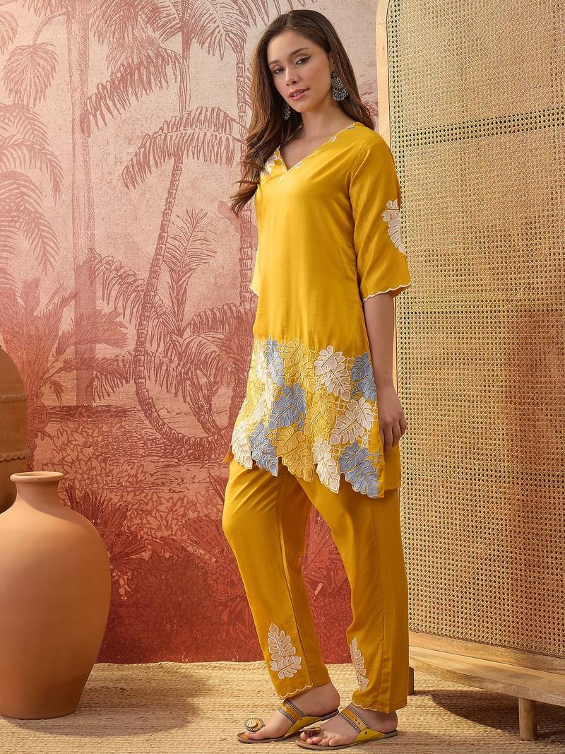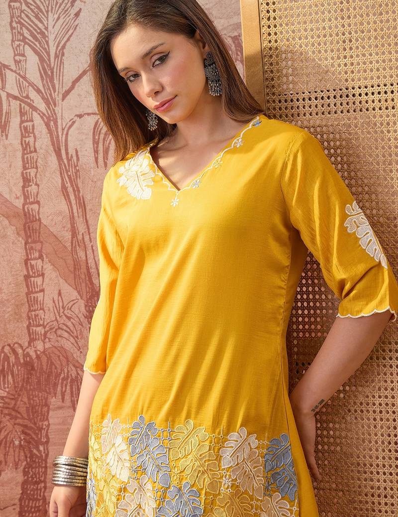 | Product Name | Women Chinon Embroidery Mustard Kruta Set | |