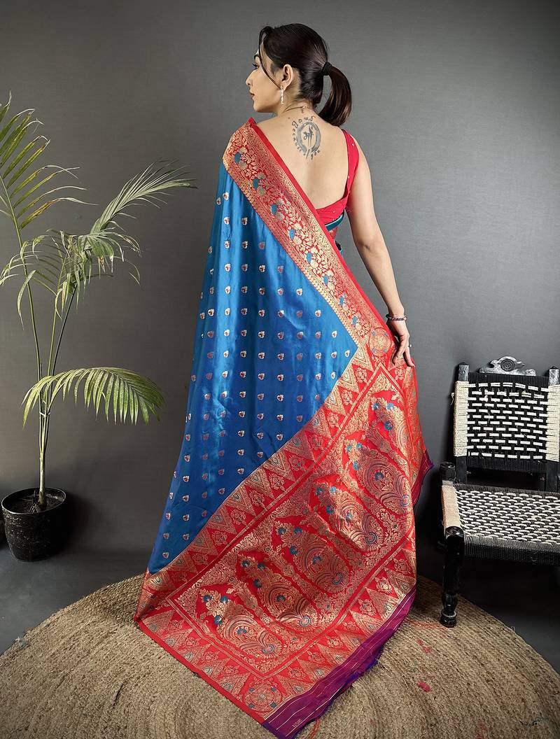 Intricate motifs blue soft silk banarasi saree