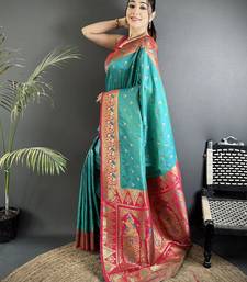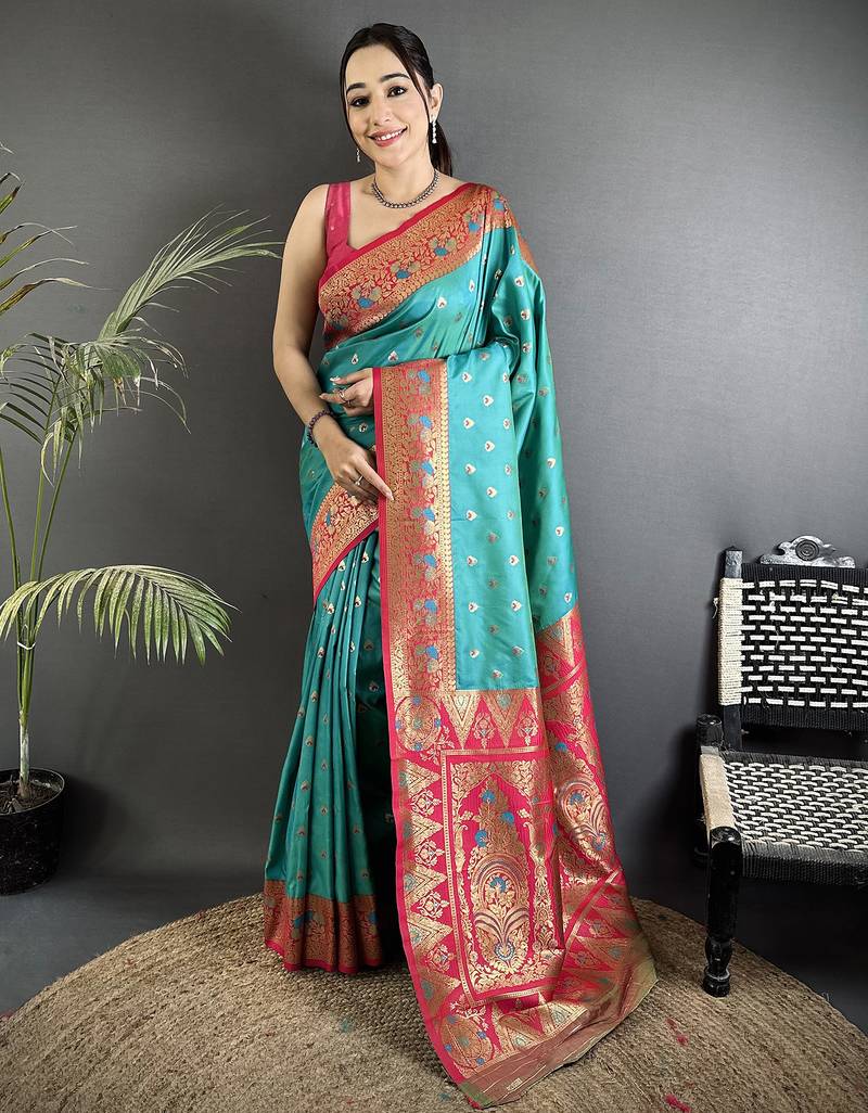 Intricate motifs teal blue soft silk banarasi saree