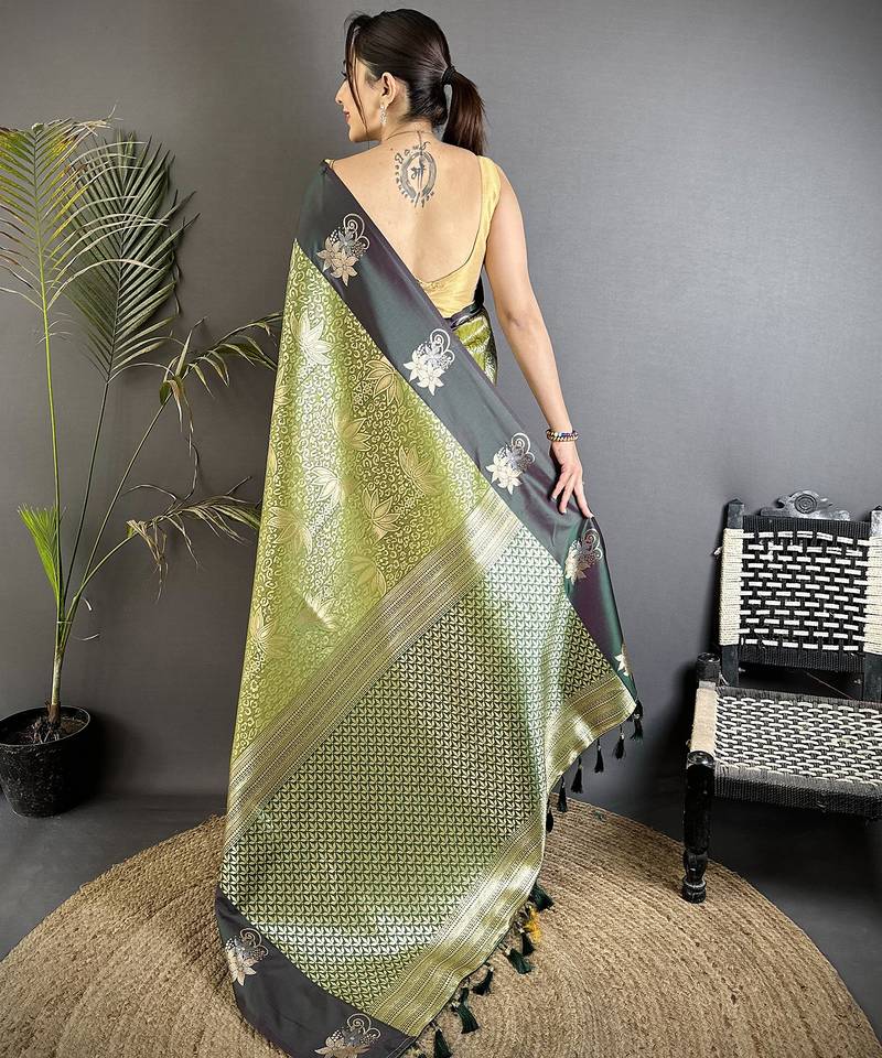 Intricate zari weaving olive green soft silk blend dharmavaram saree