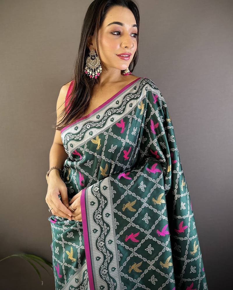 Jacquard woven pattern dark green lichi soft silk banarasi saree