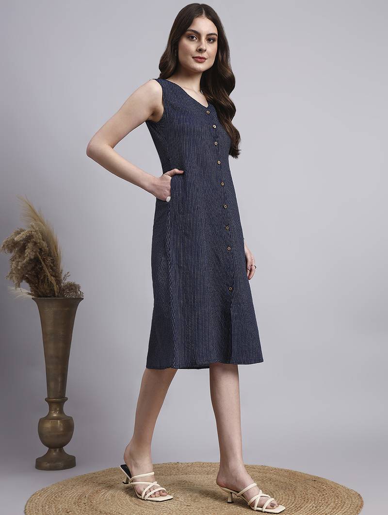 Women navy solid kantha dress stitched