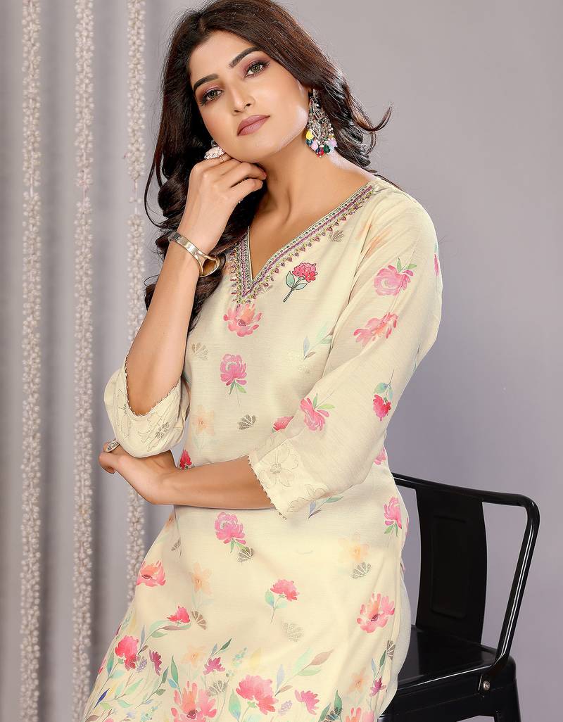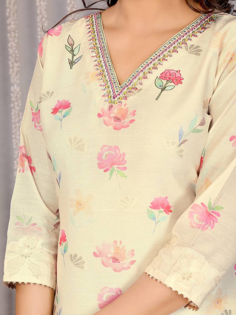 Women off white floral chanderi kurta set