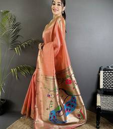 Peacock & floral motifs light orange tissue paithani saree