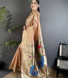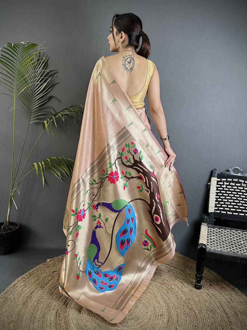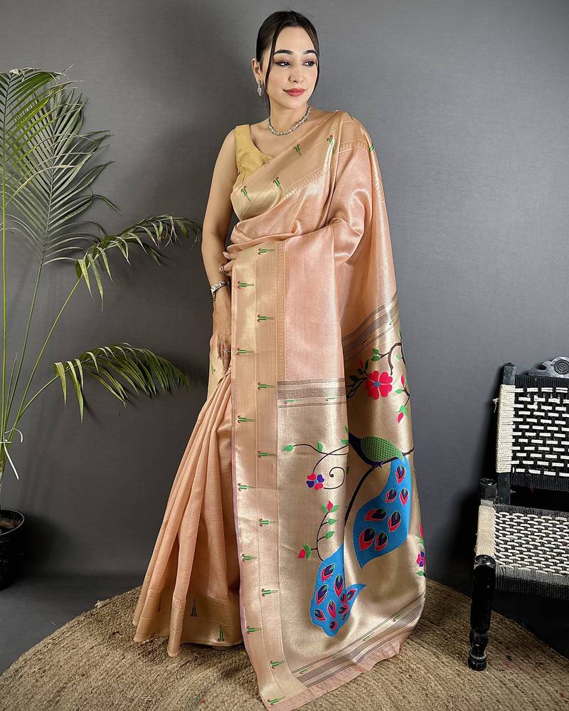 Peacock & floral motifs peach tissue paithani saree