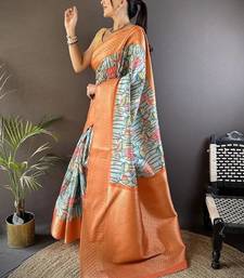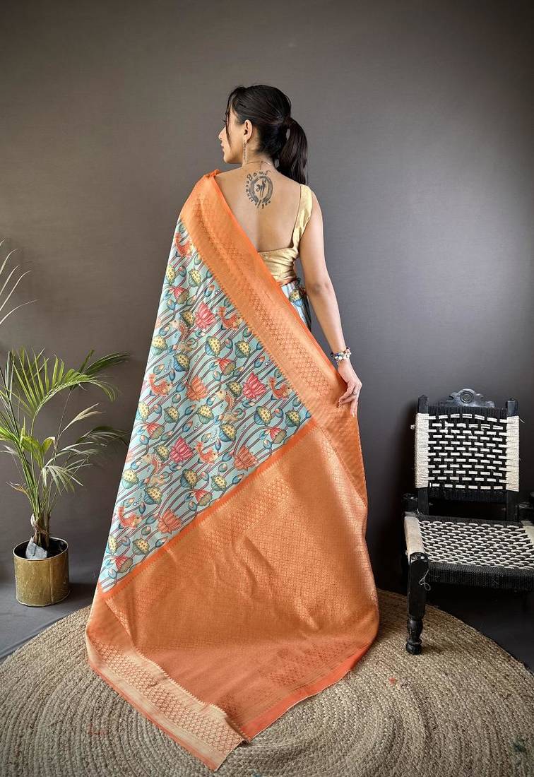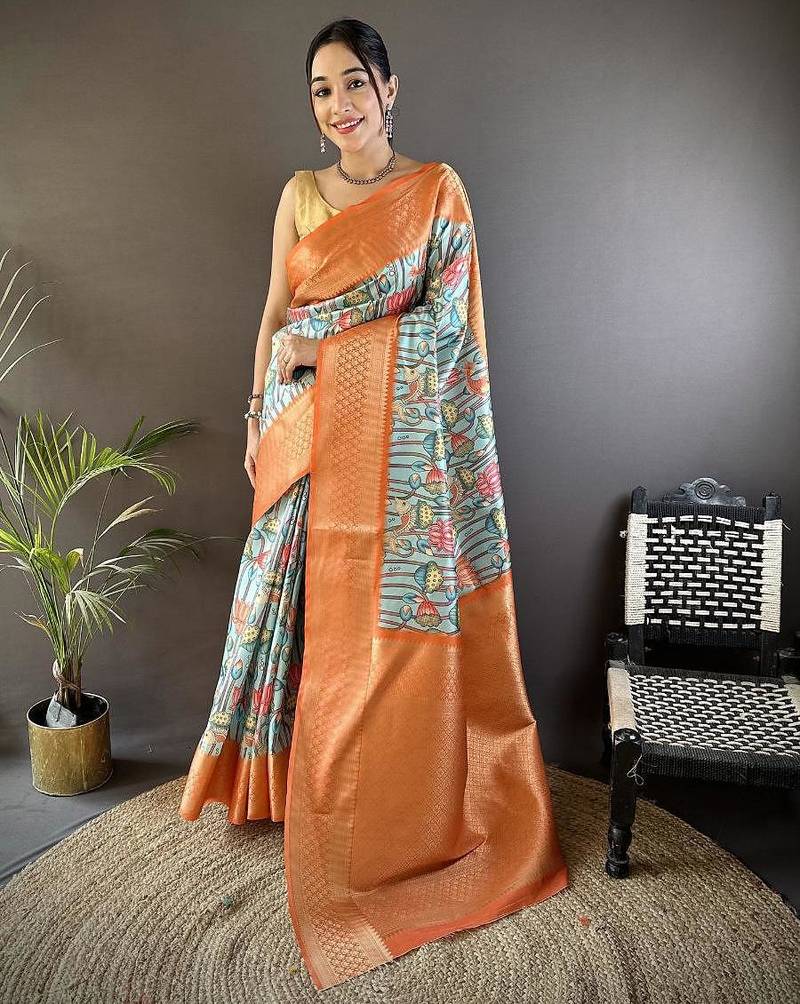Soft lichi art silk beige::Orange multi-color floral digital print paithani saree