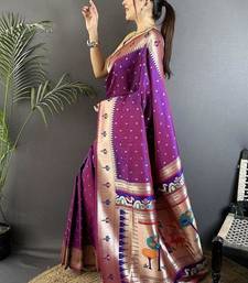 Soft lichi art silk magenta peacock & floral motifs kanchipuram saree