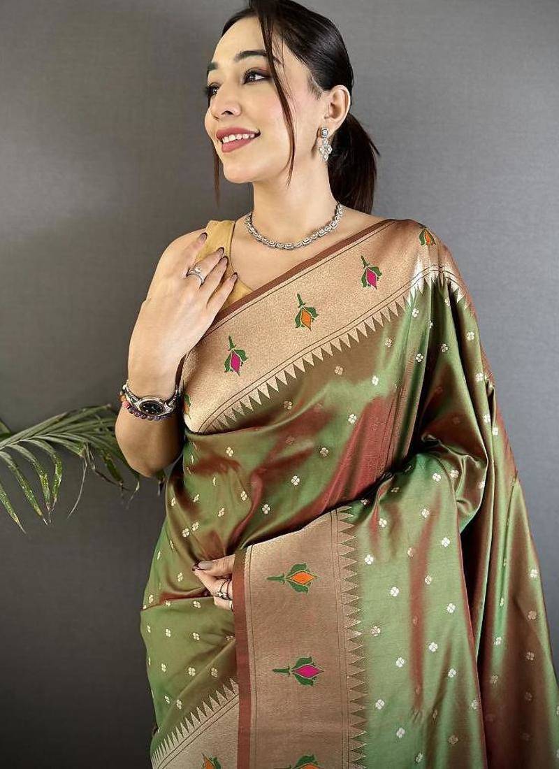 Soft lichi art silk mehendi green peacock & floral motifs kanchipuram saree