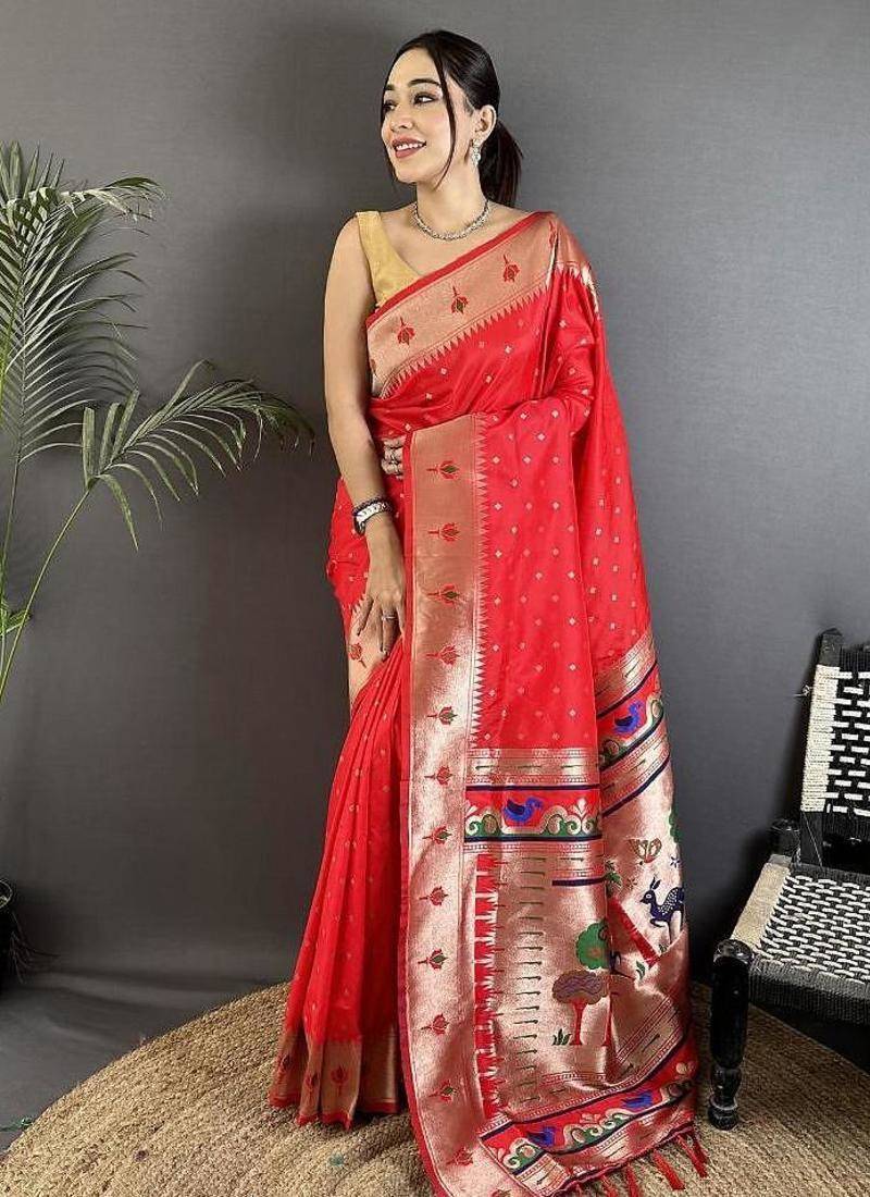 | Product Name | Soft Lichi Art Silk Red Peacock & Floral Motifs Kanchipuram Saree | |