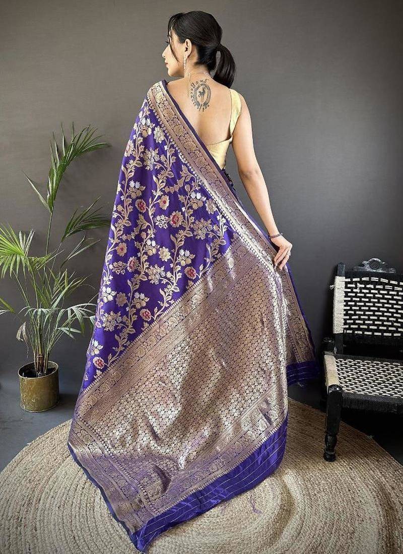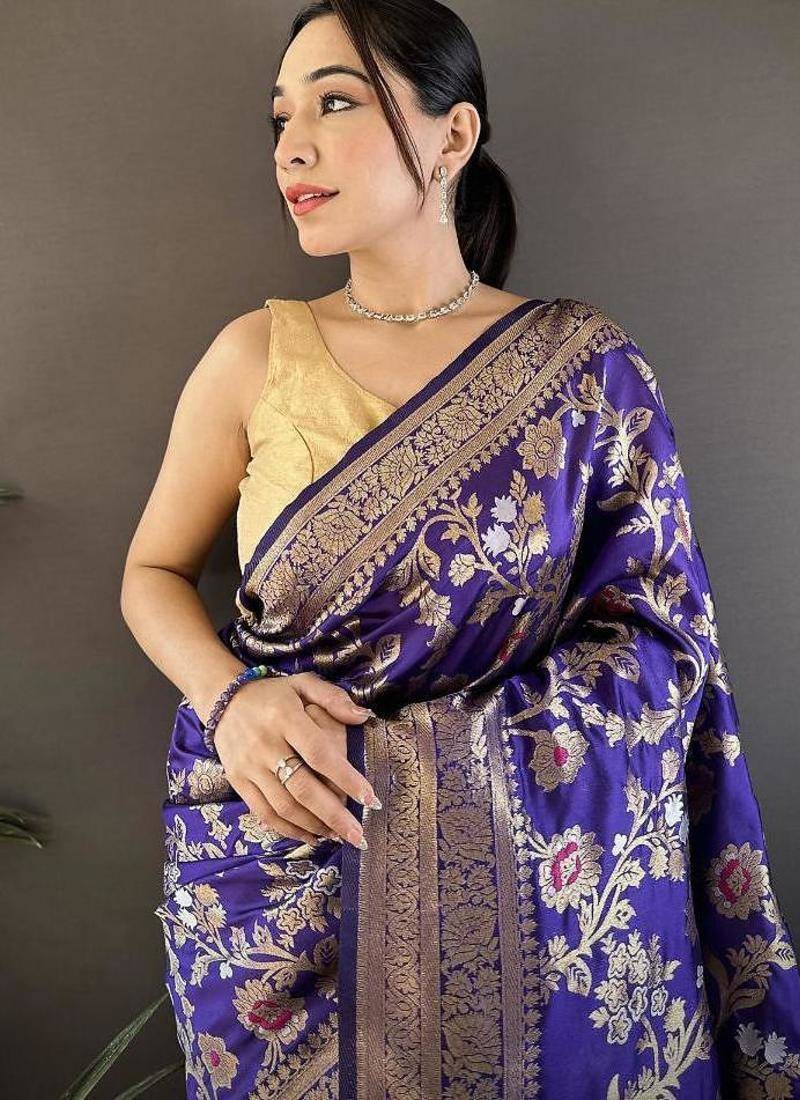 Soft art silk violet floral & ethnic motifs design meenakari banarasi
