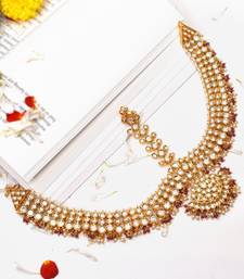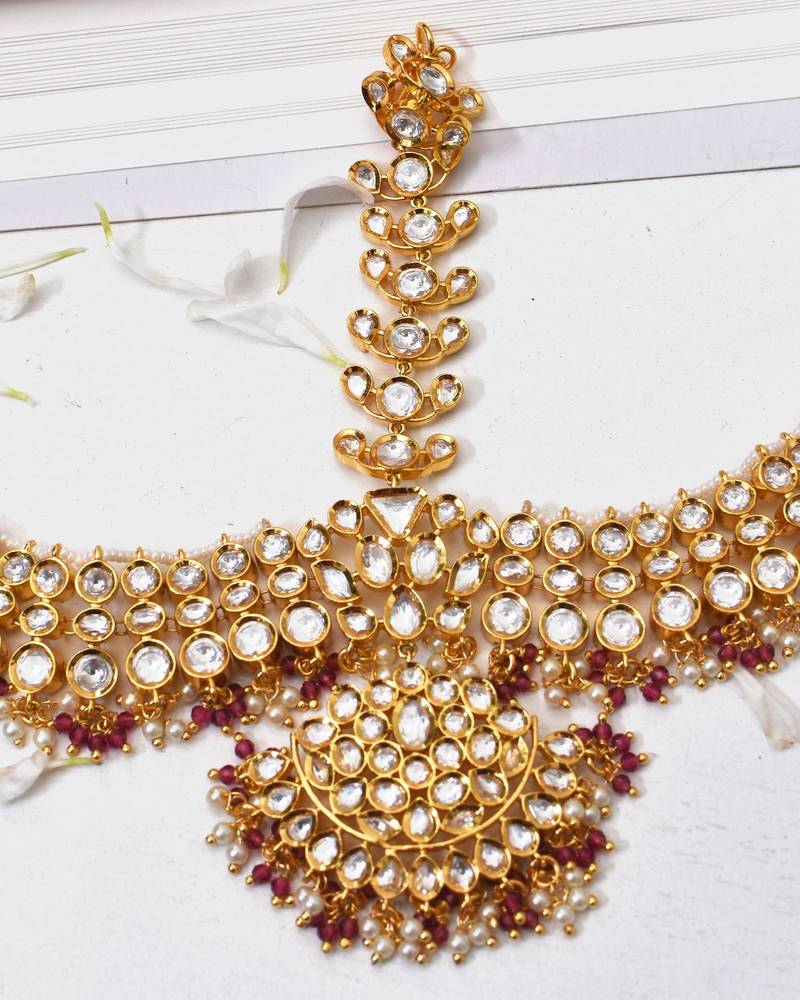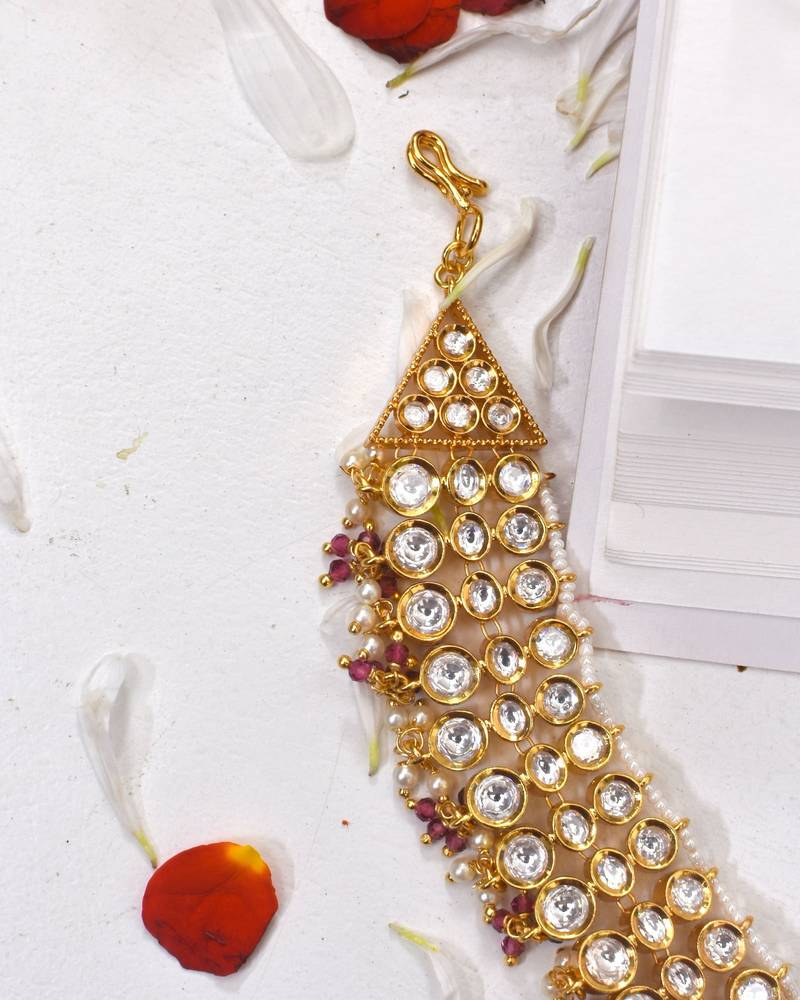 This Statement Mathapatti Handcrafted With High Quality Moissoniate Polki And Accented With Pearls Exudes An Elegant And Timeless Charm Which Looks Next To Real. The Blend Of Delicate Pearls & Ruby Small Beads Creates The Perfect Accessory For A Bride Who Wants To Make A Regal Impression.