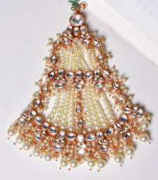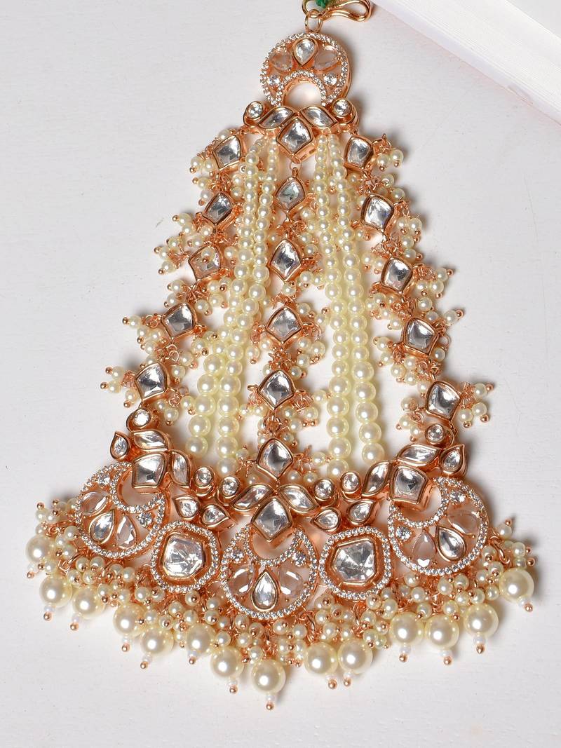 Introducing The Fatima Polki Passa, A Beautifully Handcrafted Head Ornament Featuring Moissoniate Polki With Antique Gold Plating With A Touch Of Pearls. This Exquisite Piece Is Designed To Ensure Brides Shine On Their Special Day, Offering Unmatched Elegance And Grandeur. This Passa Is The Perfect Statement Of Bridal Beauty And Sophistication.