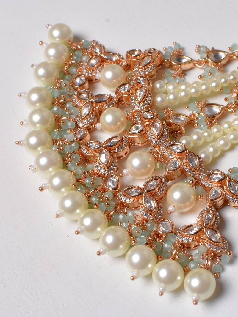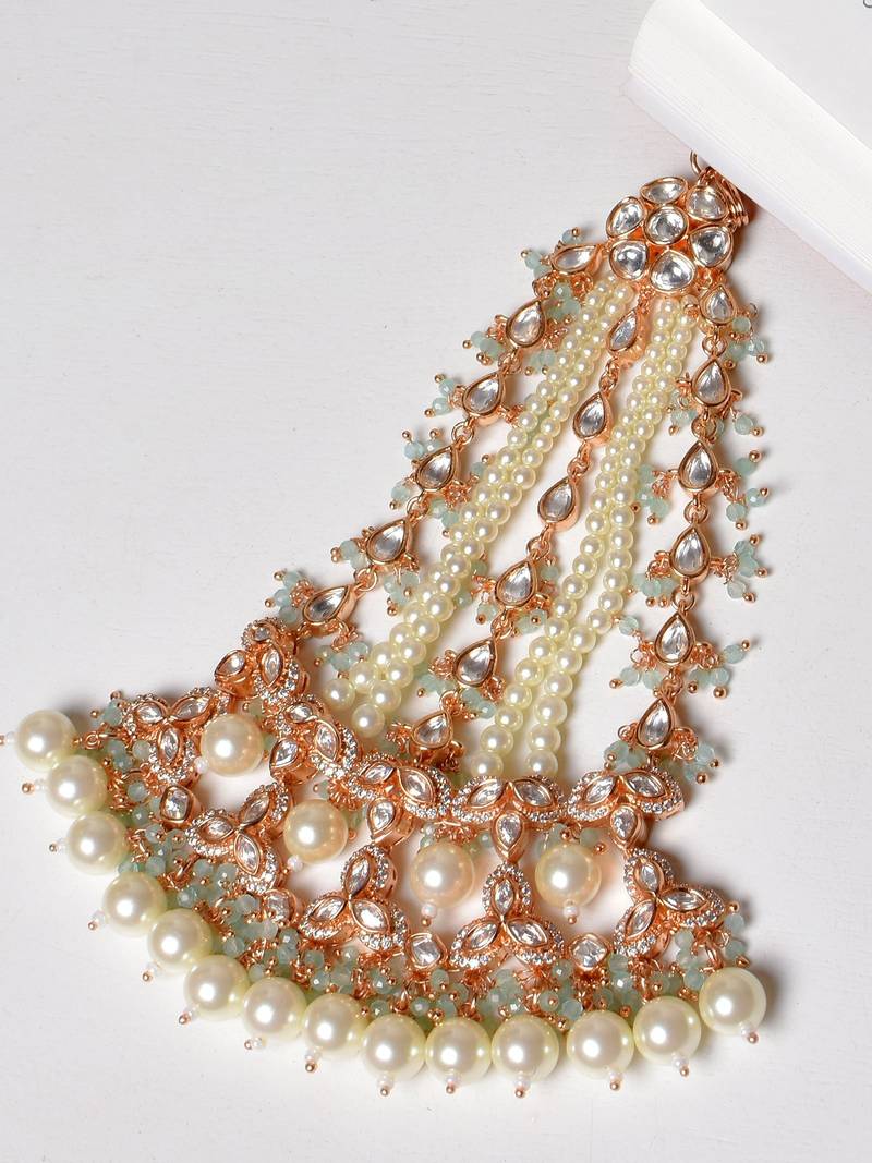| Product Description | Introducing The Heena Polki Passa, A Beautifully Handcrafted Head Ornament Featuring Moissoniate Polki With Antique Gold Plating With A Touch Of Mint Green Beads And Pearls. This Exquisite Piece Is Designed To Ensure Brides Shine On Their Special Day, Offering Unmatched Elegance And Grandeur. This Passa Is The Perfect Statement Of Bridal Beauty And Sophistication. Includes: One Passa |