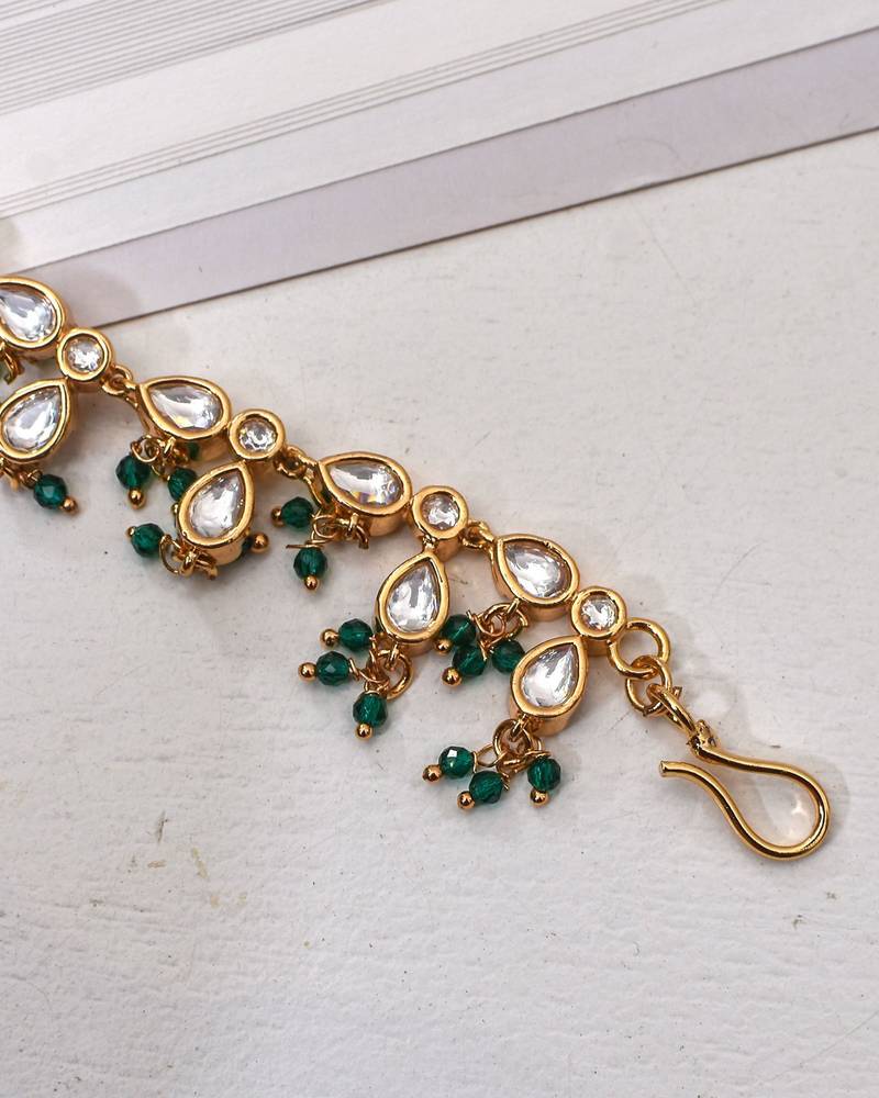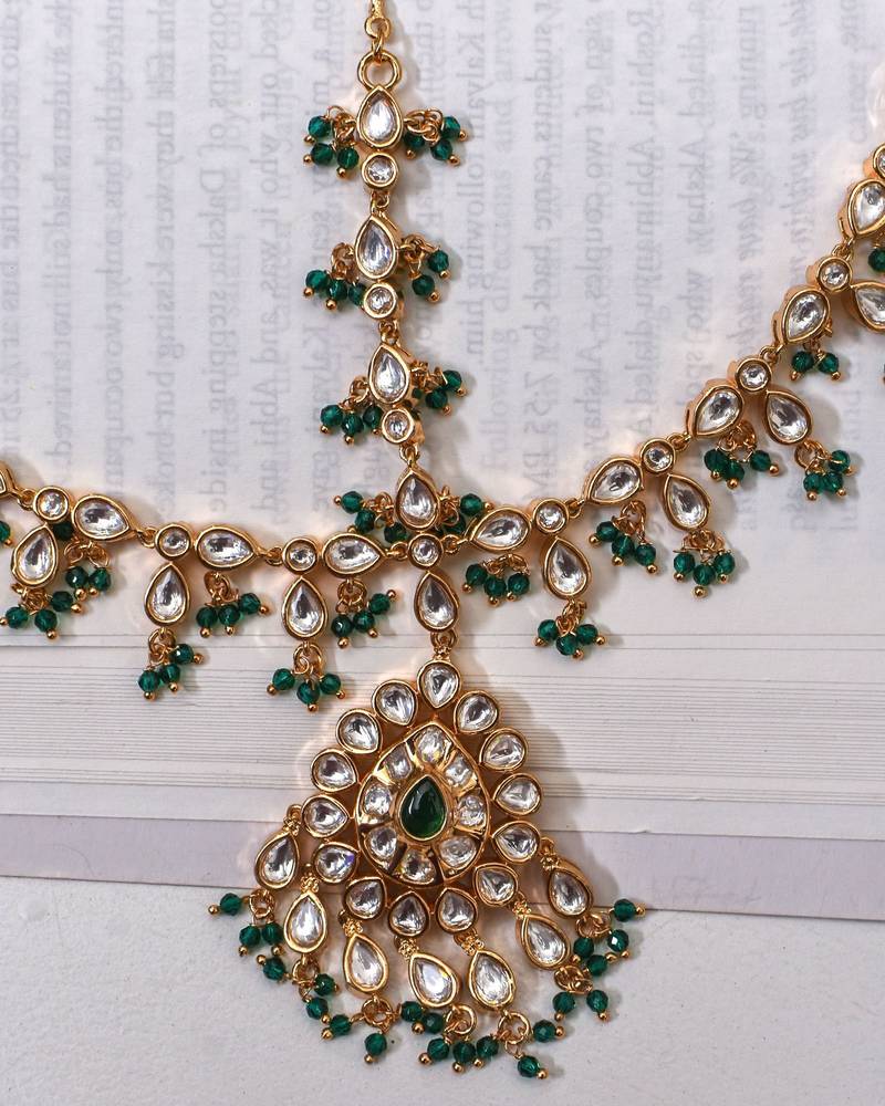 This Statement Mathapatti Handcrafted With Kundan Polki And Accented With Pearls Exudes An Elegant And Timeless Charm. The Blend Of Delicate Pearls & Green Small Beads Creates The Perfect Accessory For A Bride Who Wants To Make A Regal Impression.