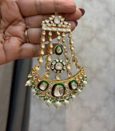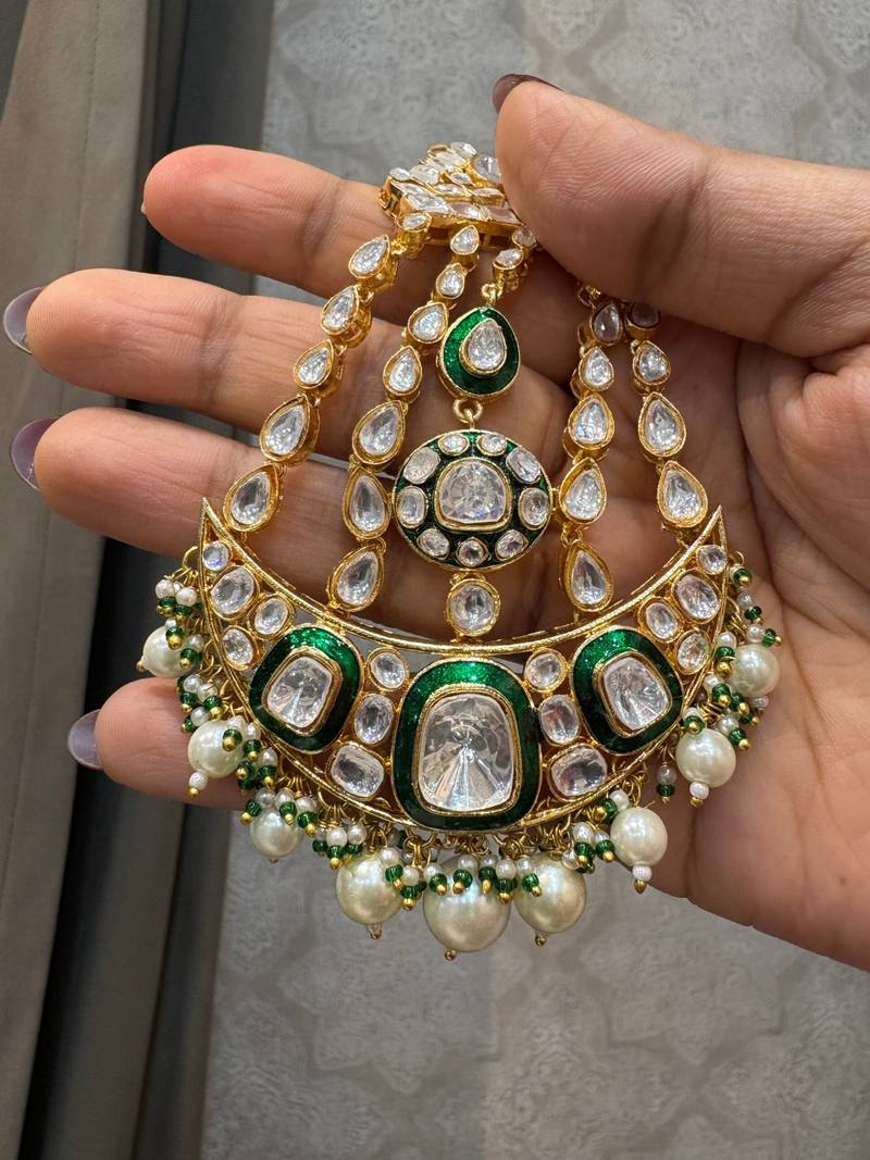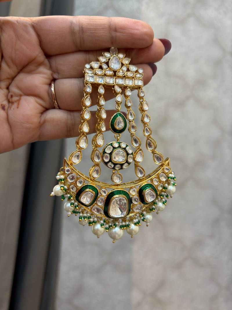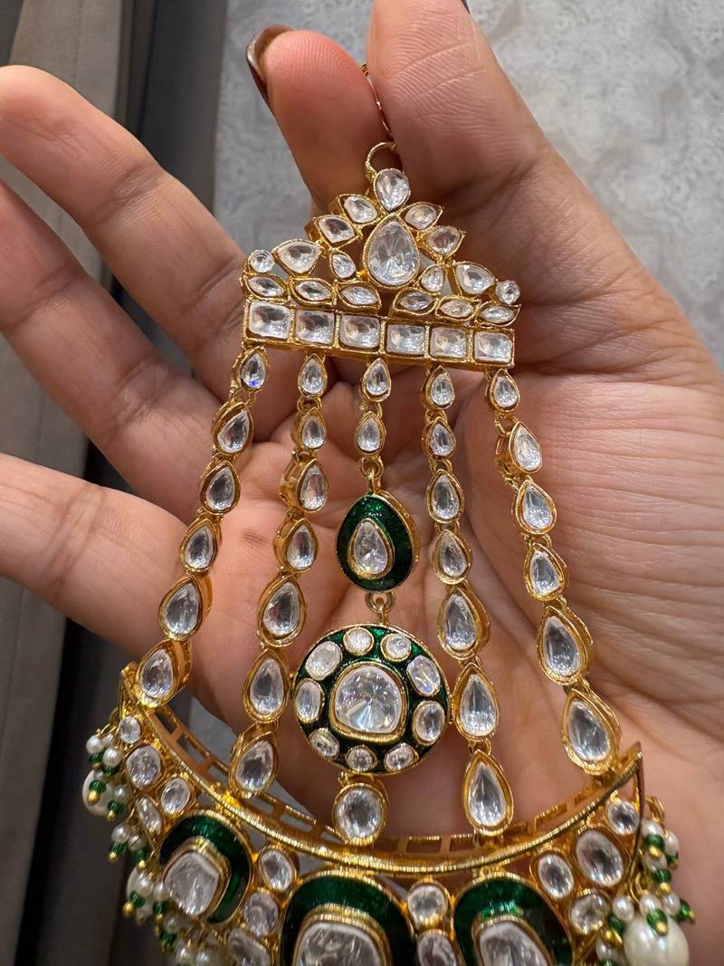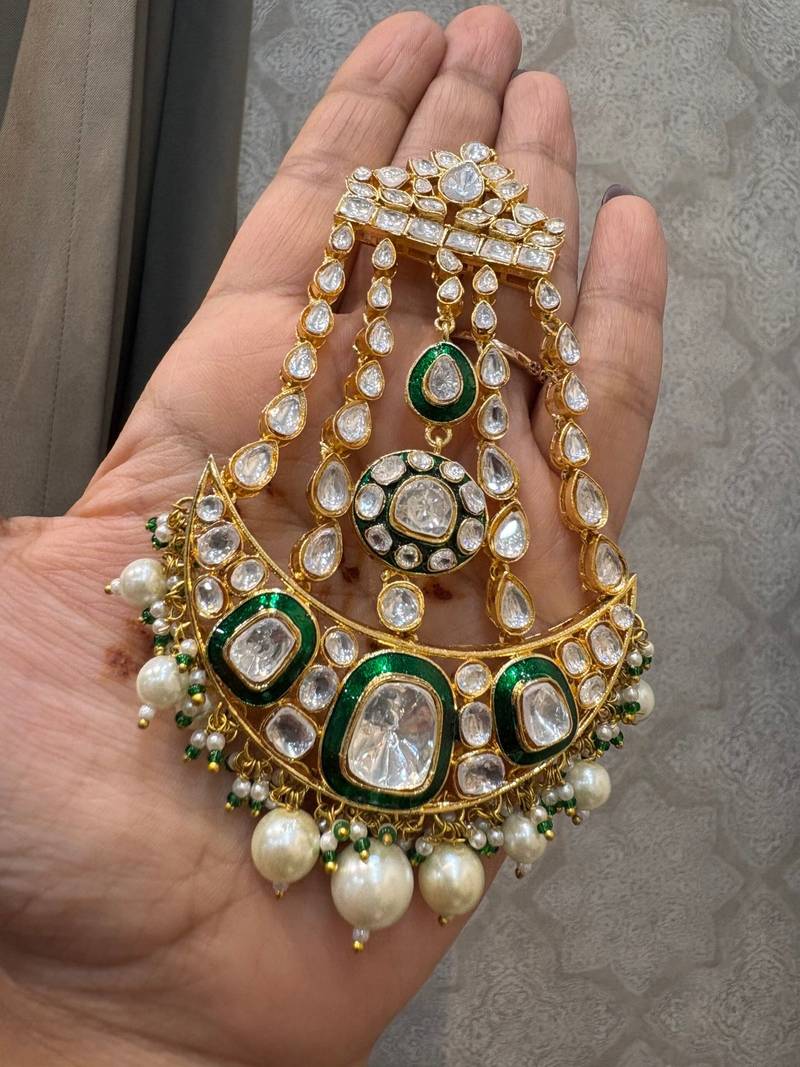 | Product Description | Introducing The Sahara Polki Passa, A Beautifully Handcrafted Head Ornament Featuring Moissoniate Polki With Green Meenakari In Gold Polish With A Touch Of Pearls Hanging. This Exquisite Piece Is Designed To Ensure Brides Shine On Their Special Day, Offering Unmatched Elegance And Grandeur. The Sahara Passa Is The Perfect Statement Of Bridal Beauty And Sophistication. Includes: One Passa |