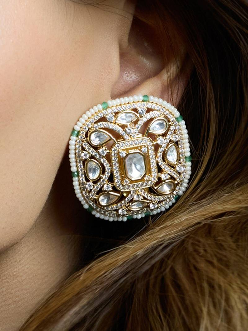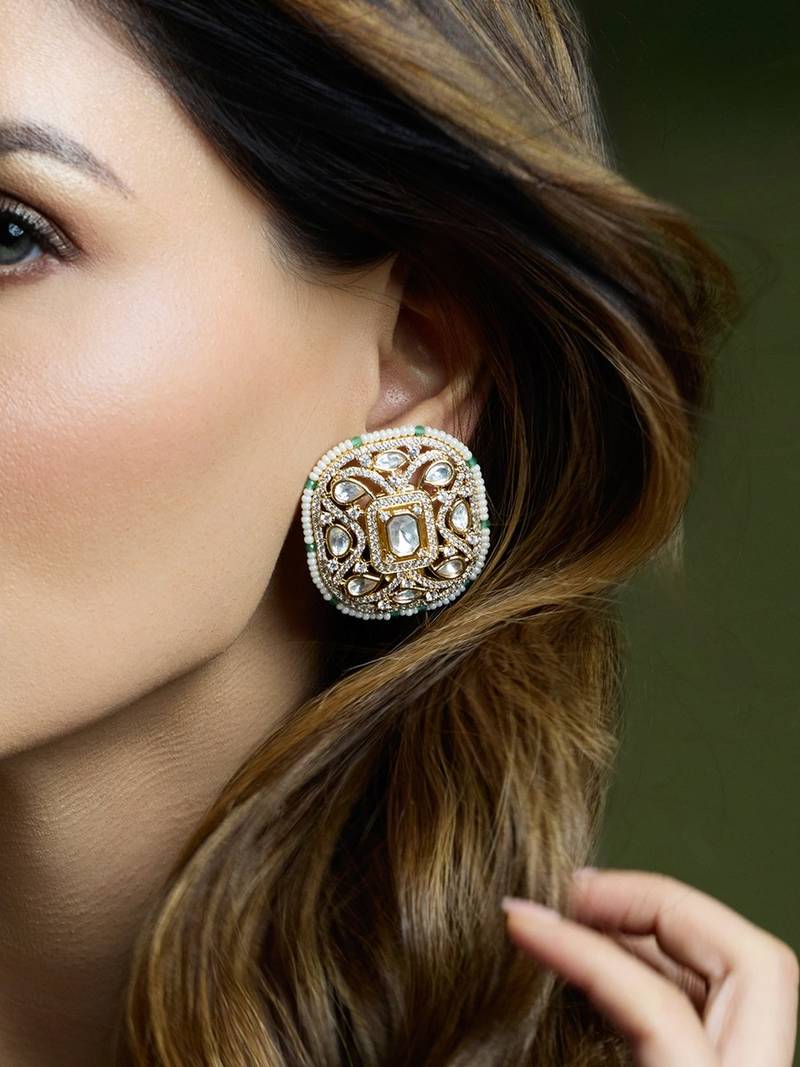 Product Description | Add A Touch Of Royal Elegance With Emerald Bloom Polki Stud Earrings, Featuring Intricate Floral Design, Uncut Polki Stones, And Delicate Green Accents For Timeless Beauty.