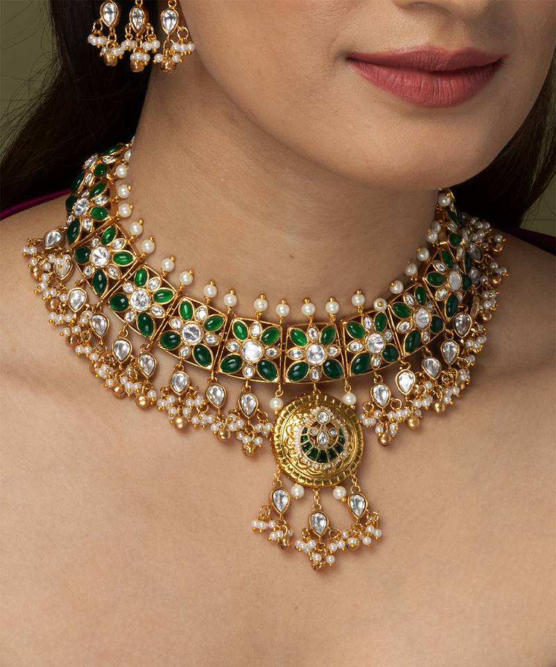 | Product Description | This Sparkling Shopjbr Necklace Set Features A Traditional Design With Vibrant Green Stones Set In Kundan Style Frames. Delicate Pearl Clusters Dangle Below, Perfectly Complementing The Central Medallion And The Elegant, Matching Stud Earrings.