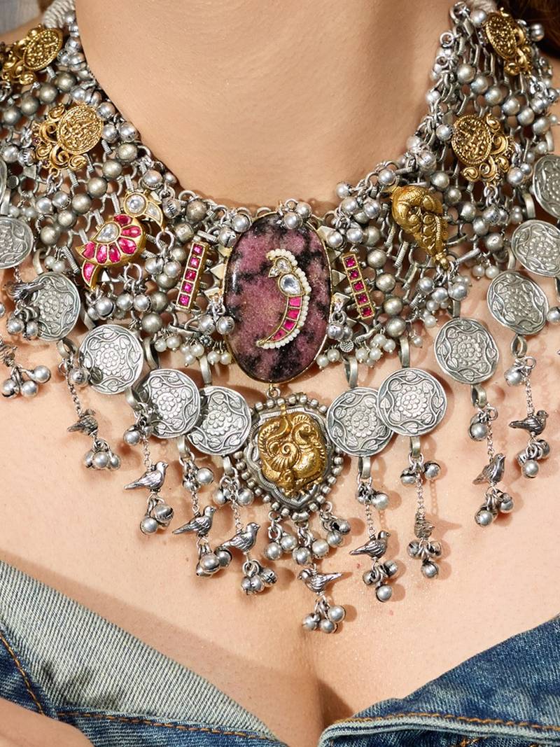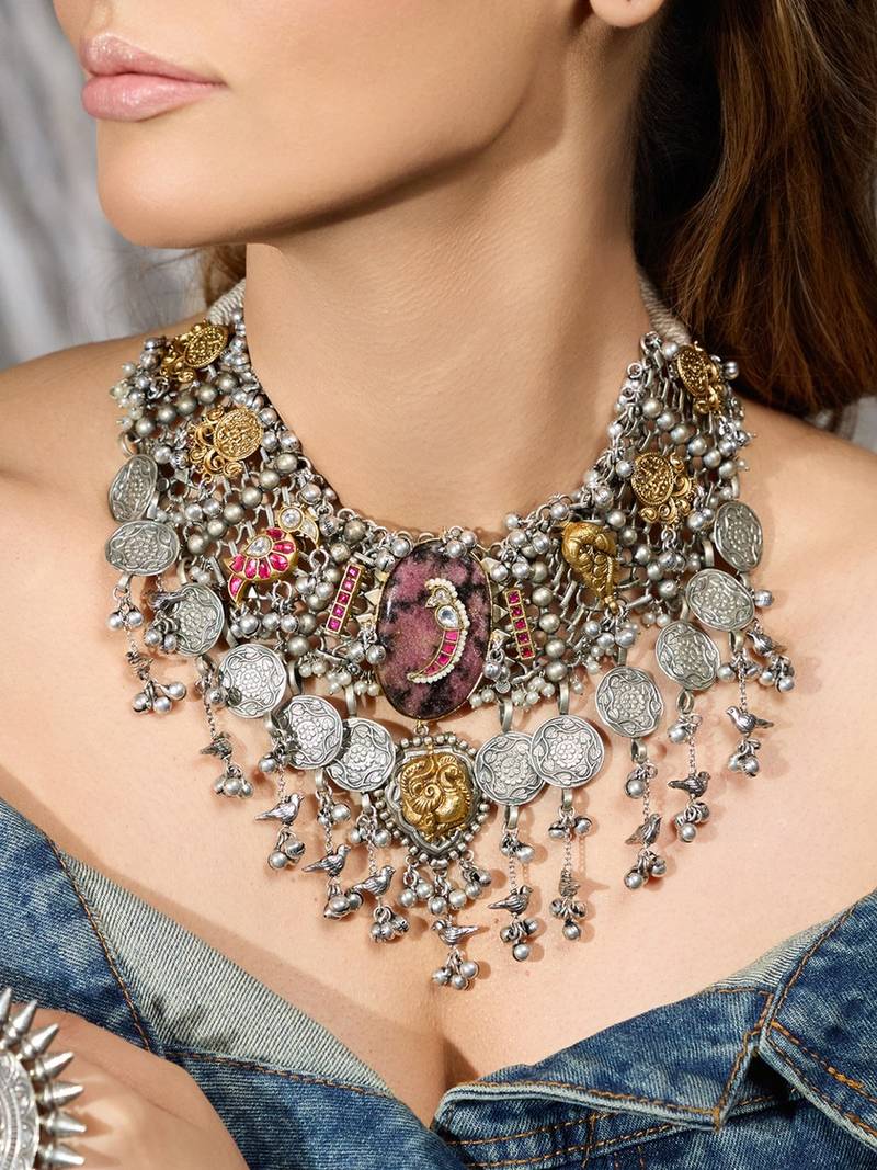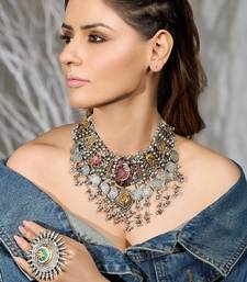 | Product Description | A Stunning Display Of Antique Elegance, This Oxidized Silver Necklace Features Floral Gold Accents And Intricate Danglers, Creating A Cascading Effect Inspired By Royal And Timeless Heritage Design.