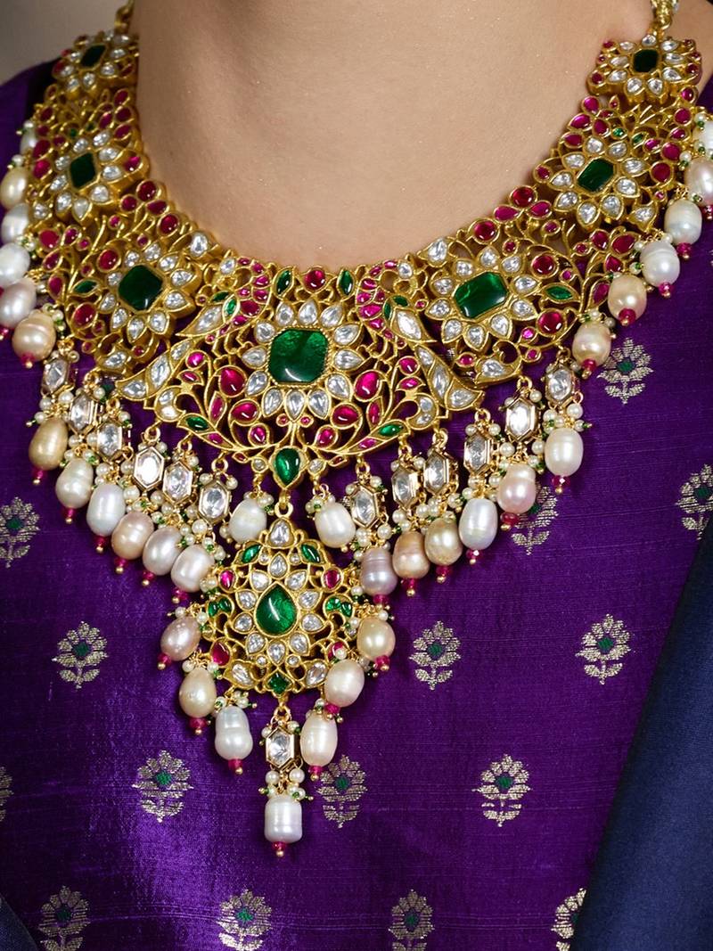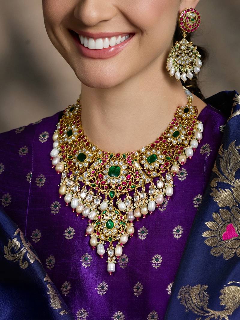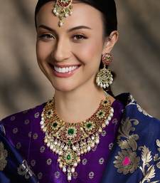 | Product Description | Luxurious Gold Finish Necklace Adorned With Polki Stones And Emerald Accents. Its Grand Design Makes It Perfect For Bridal Wear, Exuding Timeless Elegance And Regal Charm For Special Occasions. Add Matching Maang Tikka To Complete The Look