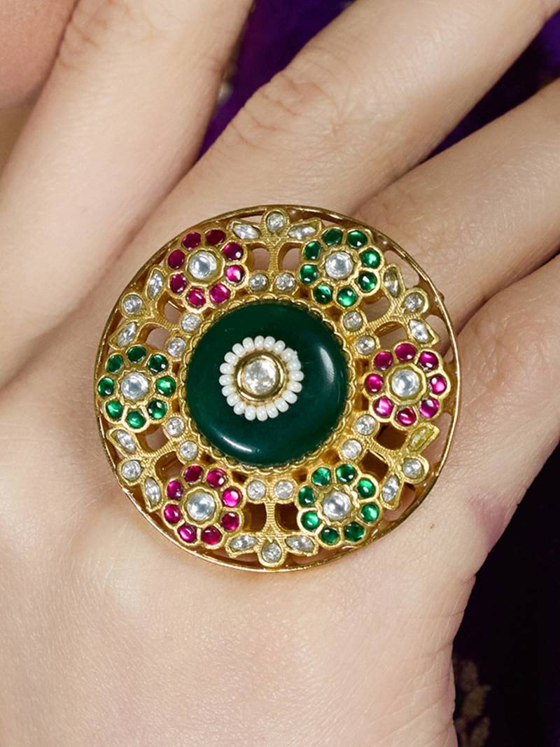Product Description | Elevate Your Style With The Emerald Royale Ring, Featuring Intricate Meenakari Work, Sparkling Stones, And A Bold Green Centerpiece—Perfect For Weddings, Festive Occasions, Or Statement Wear.