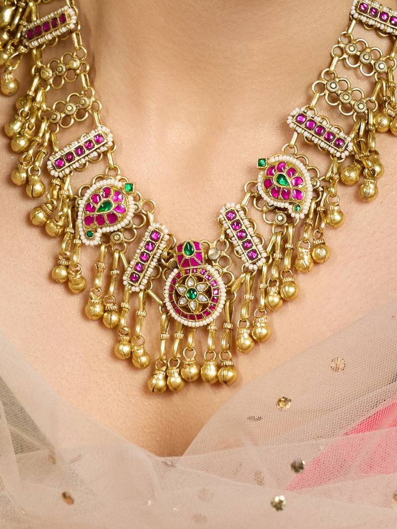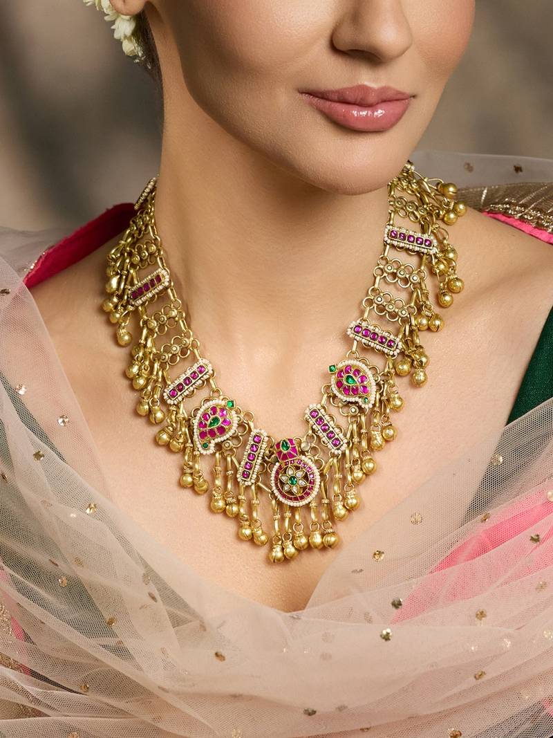 | Product Description | The Ruhani Riwaayat Bridal Set Blends Elegance With Tradition, Featuring Detailed Gold Tones And Rich Red Green Stones. Perfect For Brides Who Wish To Enhance Grace, Culture, And Regal Charm. Add Matching Earrings & Accessories To Complete The Look.