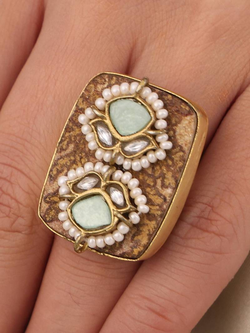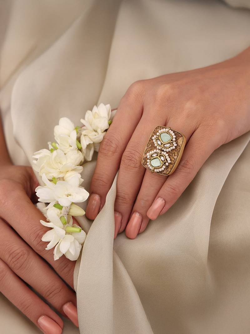 | Product Description | Highlight Your Wrist With The Turquoise Grace Kundan Ring With Premium Rectangle Gold Plated Alloy. It Has An Intricate Design That Complements Your Boho Look Styles.