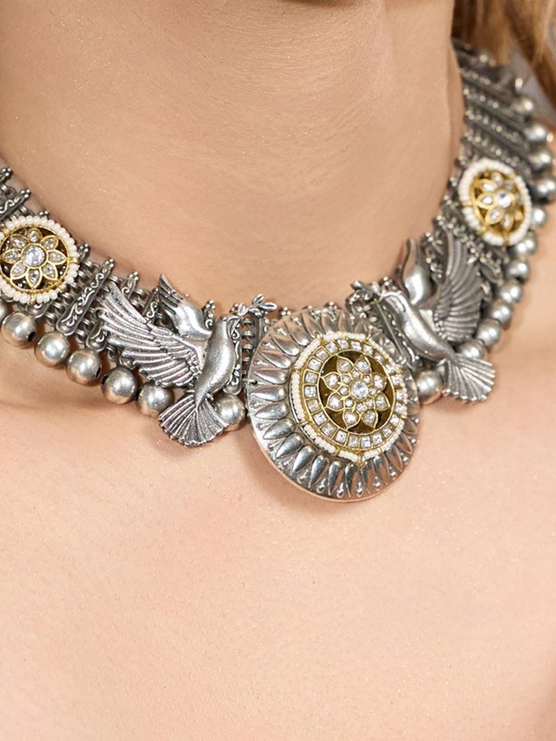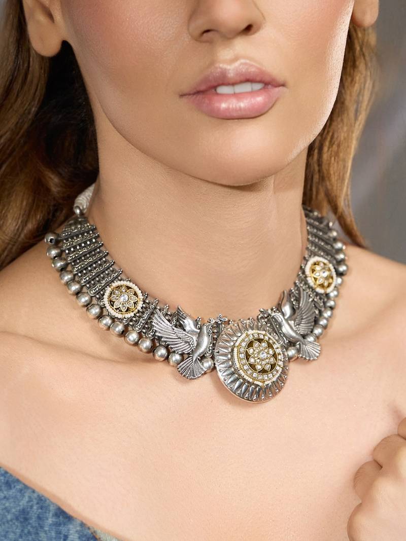| Product Description | A Blend Of Elegance And Traditional Look, This Choker Showcases Intricate Oxidized Detailing With Antique Gold Accents And Floral Motifs. Perfect For Pairing With Ethnic Wear Or Boho Fusion Outfits.