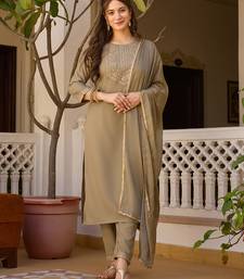 Beige embroidered rayon kurta set with dupatta stitched